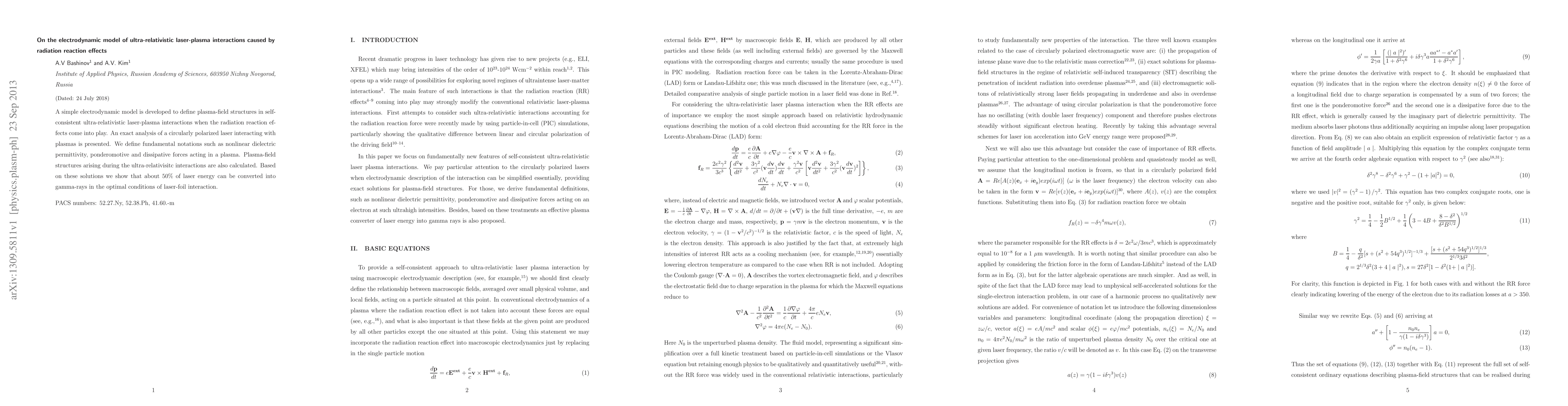 {A simple electrodynamic model is developed to define plasma-field structures in self-consistent ultra-relativistic laser-plasma interactions when the radiation reaction effects come into play. An exact analysis of a circularly polarized laser interacting with plasmas is presented. We define fundamental notations such as nonlinear dielectric permittivity, ponderomotive and dissipative forces acting in a plasma. Plasma-field structures arising during the ultra-relativisitc interactions are also calculated. Based on these solutions we show that about 50% of laser energy can be converted into gamma-rays in the optimal conditions of laser-foil interaction.
