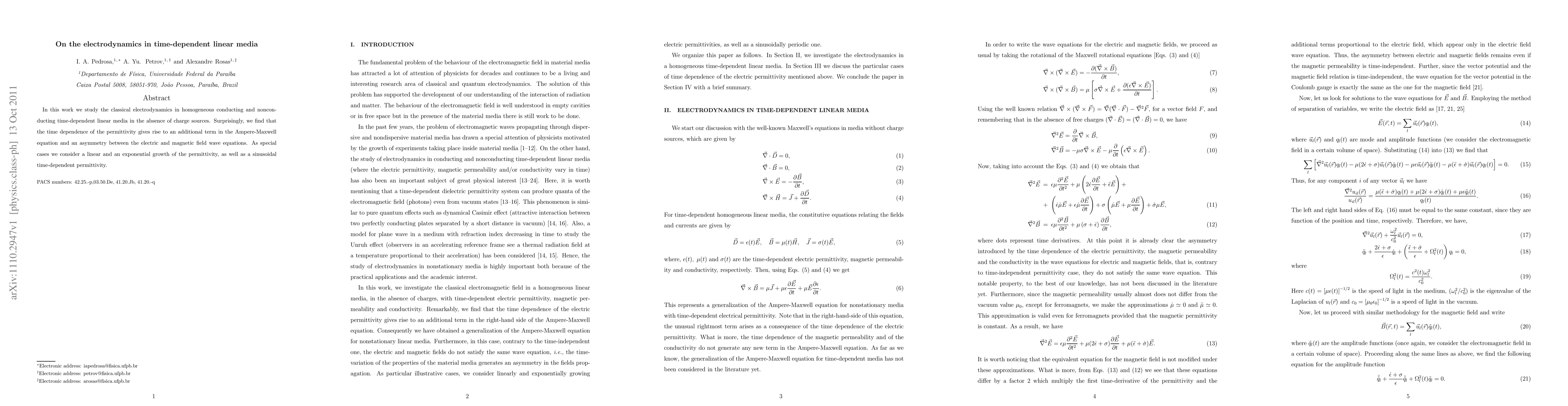 In this work we study the classical electrodynamics in homogeneous conducting and nonconducting time-dependent linear media in the absence of charge sources. Surprisingly, we find that the time dependence of the permittivity gives rise to an additional term in the Ampere-Maxwell equation and an asymmetry between the electric and magnetic field wave equations. As special cases we consider a linear and an exponential growth of the permittivity, as well as a sinusoidal time-dependent permittivity.