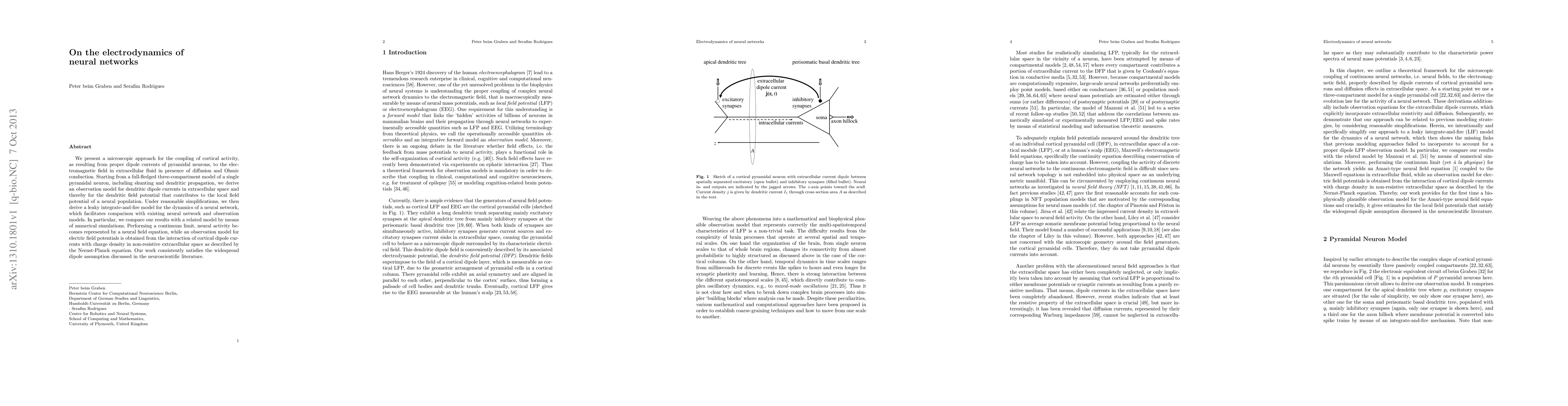 We present a microscopic approach for the coupling of cortical activity, as resulting from proper dipole currents of pyramidal neurons, to the electromagnetic field in extracellular fluid in presence of diffusion and Ohmic conduction. Starting from a full-fledged three-compartment model of a single pyramidal neuron, including shunting and dendritic propagation, we derive an observation model for dendritic dipole currents in extracellular space and thereby for the dendritic field potential that contributes to the local field potential of a neural population. Under reasonable simplifications, we then derive a leaky integrate-and-fire model for the dynamics of a neural network, which facilitates comparison with existing neural network and observation models. In particular, we compare our results with a related model by means of numerical simulations. Performing a continuum limit, neural activity becomes represented by a neural field equation, while an observation model for electric field potentials is obtained from the interaction of cortical dipole currents with charge density in non-resistive extracellular space as described by the Nernst-Planck equation. Our work consistently satisfies the widespread dipole assumption discussed in the neuroscientific literature.