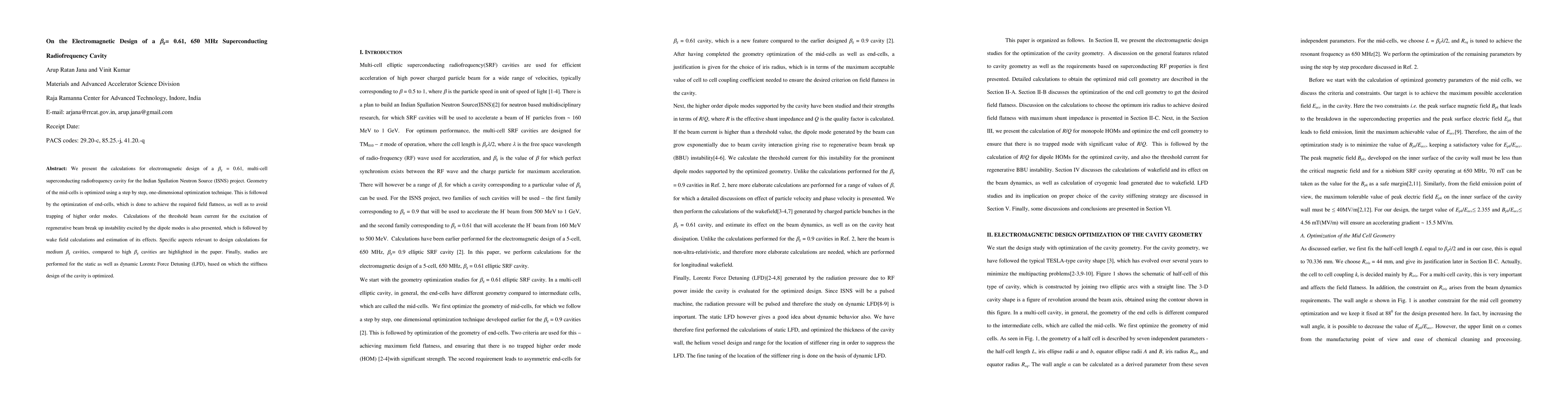 We present the calculations for electromagnetic design of a Beta_g = 0.61, multi-cell superconducting radiofrequency cavity for the Indian Spallation Neutron Source (ISNS) project. Geometry of the mid-cells is optimized using a step by step, one-dimensional optimization technique. This is followed by the optimization of end-cells, which is done to achieve the required field flatness, as well as to avoid trapping of higher order modes. Calculations of the threshold beam current for the excitation of regenerative beam break up instability excited by the dipole modes is also presented, which is followed by wake field calculations and estimation of its effects. Specific aspects relevant to design calculations for medium Beta_g cavities, compared to high Beta_g cavities are highlighted in the paper. Finally, studies are performed for the static as well as dynamic Lorentz Force Detuning (LFD), based on which the stiffness design of the cavity is optimized.
