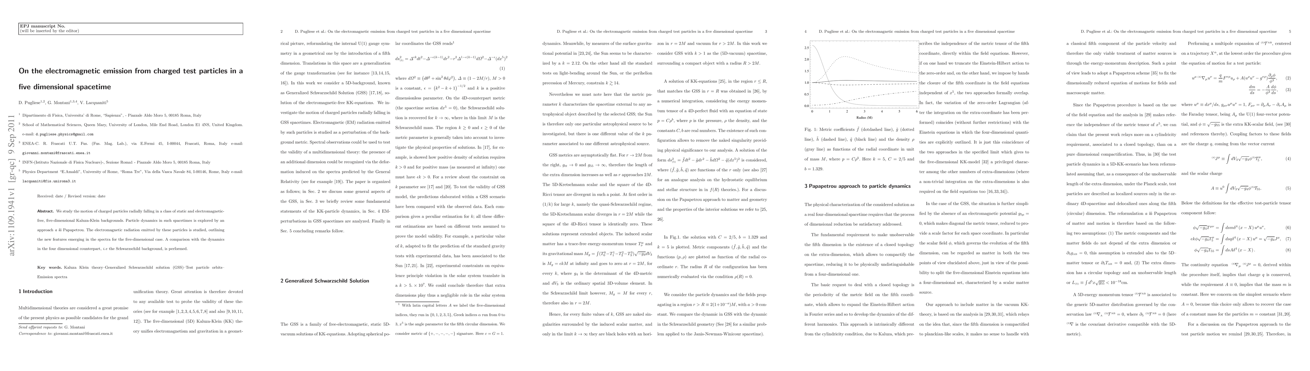 Research explores electromagnetic emission from charged particles in 5D spacetime, revealing new spectral features compared to 4D Schwarzschild background.