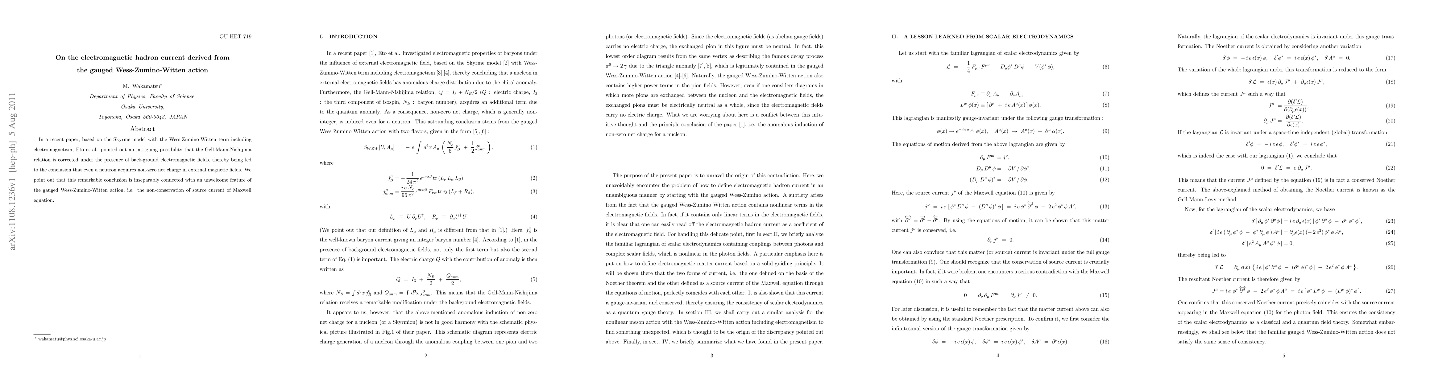 Researchers investigated the impact of electromagnetic fields on the Gell-Mann-Nishijima relation in the context of the gauged Wess-Zumino-Witten action, finding a non-conservation of Maxwell equation source current.