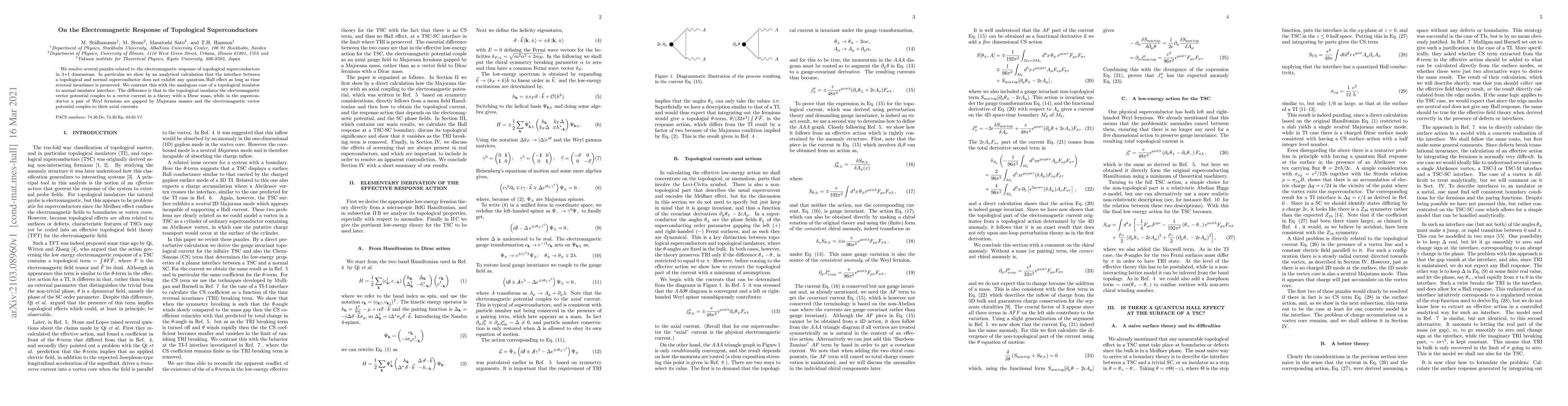 We resolve several puzzles related to the electromagnetic response of topological superconductors in 3+1 dimensions. In particular we show by an analytical calculation that the interface between a topological and normal superconductor does not exhibit any quantum Hall effect as long as time reversal invariance is preserved. We contrast this with the analogous case of a topological insulator to normal insulator interface. The difference is that in the topological insulator the electromagnetic vector potential couples to a vector current in a theory with a Dirac mass, while in the superconductor a pair of Weyl fermions are gapped by Majorana masses and the electromagnetic vector potential couples to their axial currents.