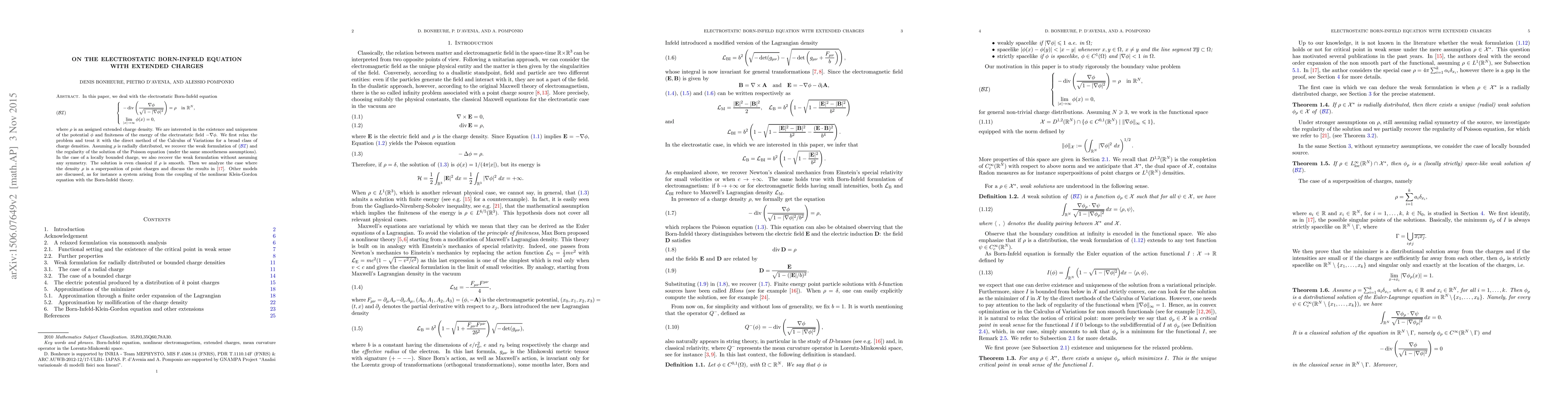 This paper investigates the existence and uniqueness of solutions to the electrostatic Born-Infeld equation with extended charges, focusing on its implications for charge density distributions and potential energy.