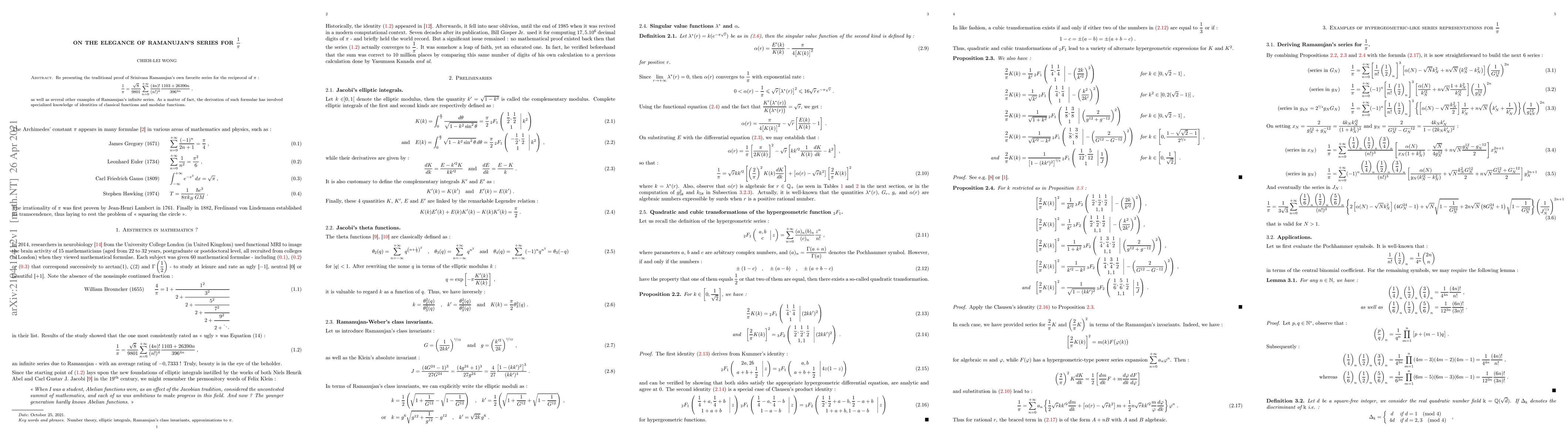 Re presenting the traditional proof of Srinivasa Ramanujan's own favorite series for the reciprocal of $\pi$ :\begin{equation}\frac{1}{\pi} = \frac{\sqrt{8}}{9801} \sum_{n=0}^{+\infty} \frac{(4n)!}{(n!)^4} \frac{1103 + 26390n}{396^{4n}} \; \text{,}\end{equation}as well as several other examples of Ramanujan's infinite series. As a matter of fact, the derivation of such formulae has involved specialized knowledge of identities of classical functions and modular functions.