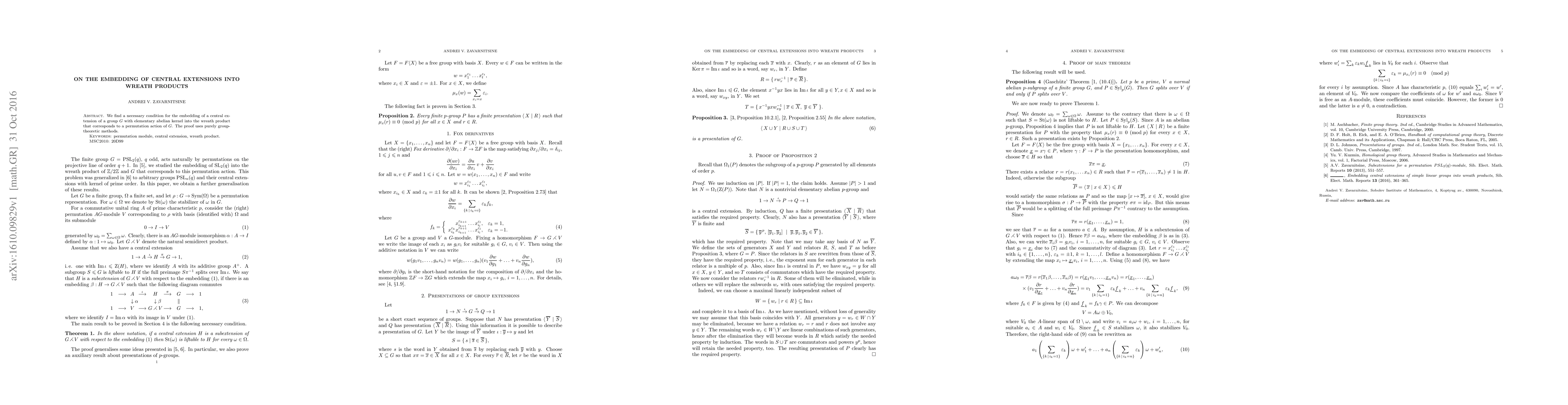 Summary: This paper establishes a necessary condition for embedding a central extension of a group $G$ with an elementary abelian kernel into its wreath product. The proof relies solely on group-theoretic techniques.