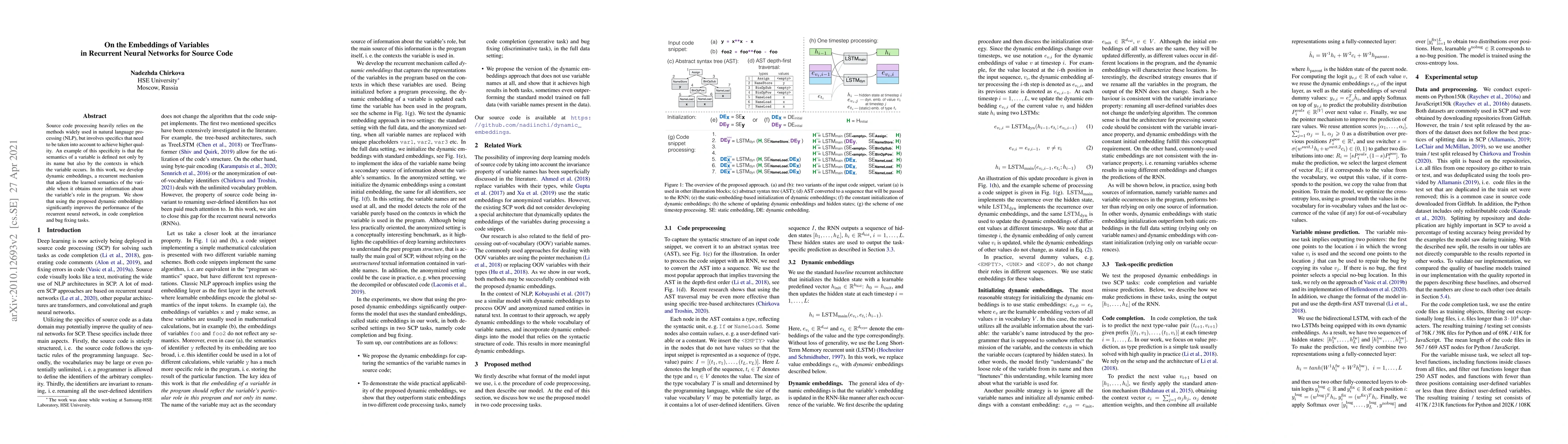 Source code processing heavily relies on the methods widely used in natural language processing (NLP), but involves specifics that need to be taken into account to achieve higher quality. An example of this specificity is that the semantics of a variable is defined not only by its name but also by the contexts in which the variable occurs. In this work, we develop dynamic embeddings, a recurrent mechanism that adjusts the learned semantics of the variable when it obtains more information about the variable's role in the program. We show that using the proposed dynamic embeddings significantly improves the performance of the recurrent neural network, in code completion and bug fixing tasks.