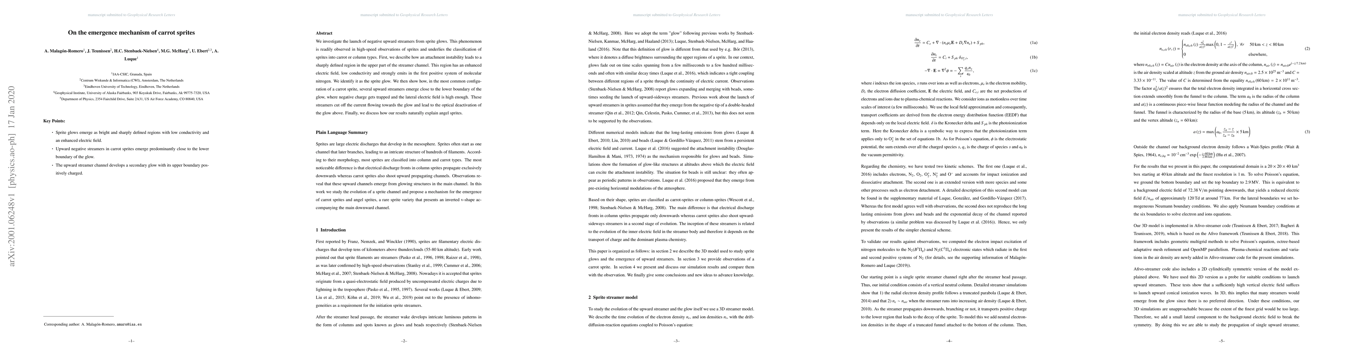This paper explores the emergence of negative upward streamers from sprite glows, classifying sprites into carrot or column types based on this phenomenon. It explains how attachment instability leads to the formation of a sprite glow with an enhanced electric field and low conductivity, and describes how upward streamers in carrot sprites trap negative charge and deactivate the glow above.