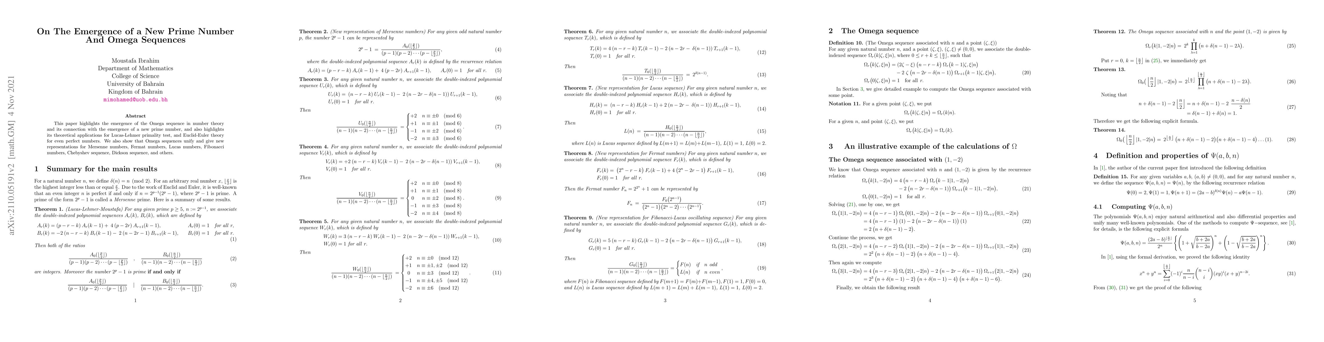 This paper highlights the emergence of the Omega sequence in number theory and its connection with the emergence of a new prime number, and also highlights its theoretical applications for Lucas-Lehmer primality test, and Euclid-Euler theory for even perfect numbers. We also show that Omega sequences unify and give new representations for Mersenne numbers, Fermat numbers, Lucas numbers, Fibonacci numbers, Chebyshev sequence, Dickson sequence, and others.