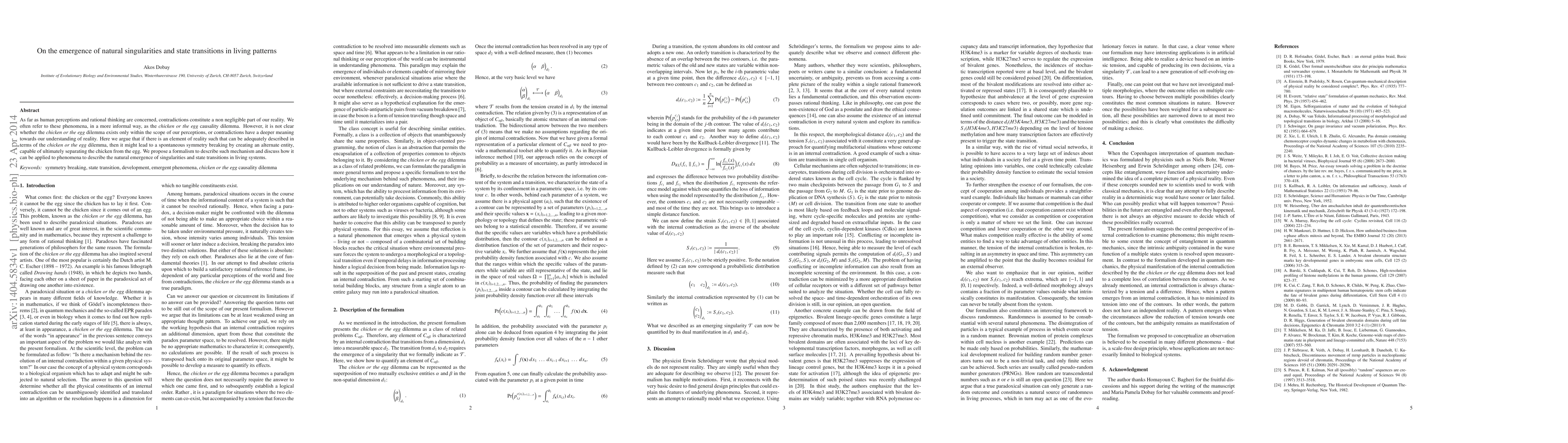 As far as human perceptions and rational thinking are concerned, contradictions constitute a non negligible part of our reality. We often refer to these phenomena, in a more informal way, as the chicken or the egg causality dilemma. However, it is not clear whether the chicken or the egg dilemma exists only within the scope of our perceptions, or contradictions have a deeper meaning towards our understanding of reality. Here we argue that if there is an element of reality such that can be adequately described in terms of the chicken or the egg dilemma, then it might lead to a spontaneous symmetry breaking by creating an alternate entity, capable of ultimately separating the chicken from the egg. We propose a formalism to describe such mechanism and discuss how it can be applied to phenomena to describe the natural emergence of singularities and state transitions in living systems.