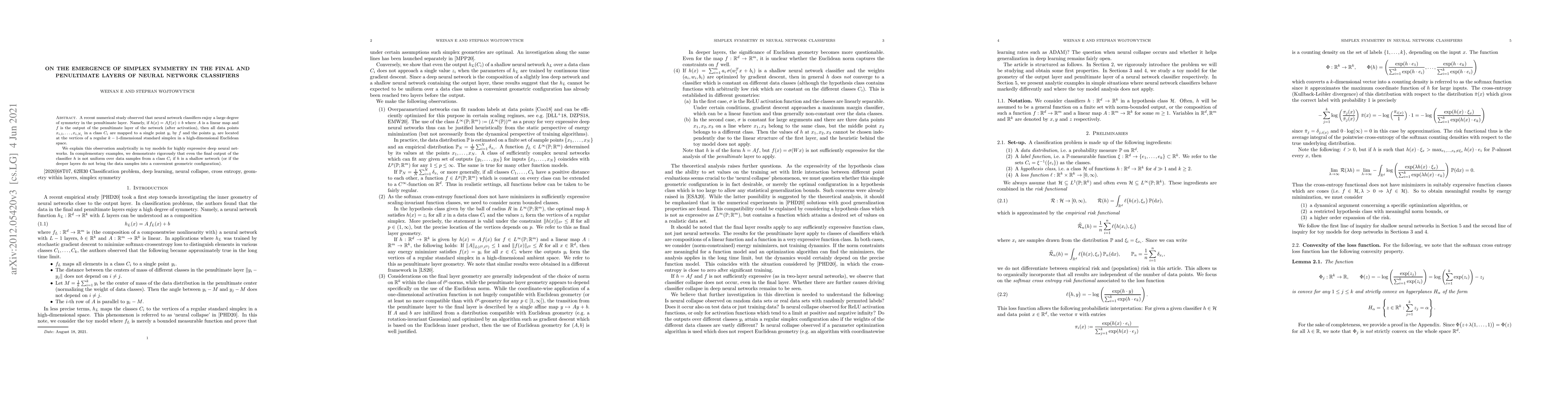 A recent numerical study observed that neural network classifiers enjoy a large degree of symmetry in the penultimate layer. Namely, if $h(x) = Af(x) +b$ where $A$ is a linear map and $f$ is the output of the penultimate layer of the network (after activation), then all data points $x_{i, 1}, \dots, x_{i, N_i}$ in a class $C_i$ are mapped to a single point $y_i$ by $f$ and the points $y_i$ are located at the vertices of a regular $k-1$-dimensional standard simplex in a high-dimensional Euclidean space. We explain this observation analytically in toy models for highly expressive deep neural networks. In complementary examples, we demonstrate rigorously that even the final output of the classifier $h$ is not uniform over data samples from a class $C_i$ if $h$ is a shallow network (or if the deeper layers do not bring the data samples into a convenient geometric configuration).