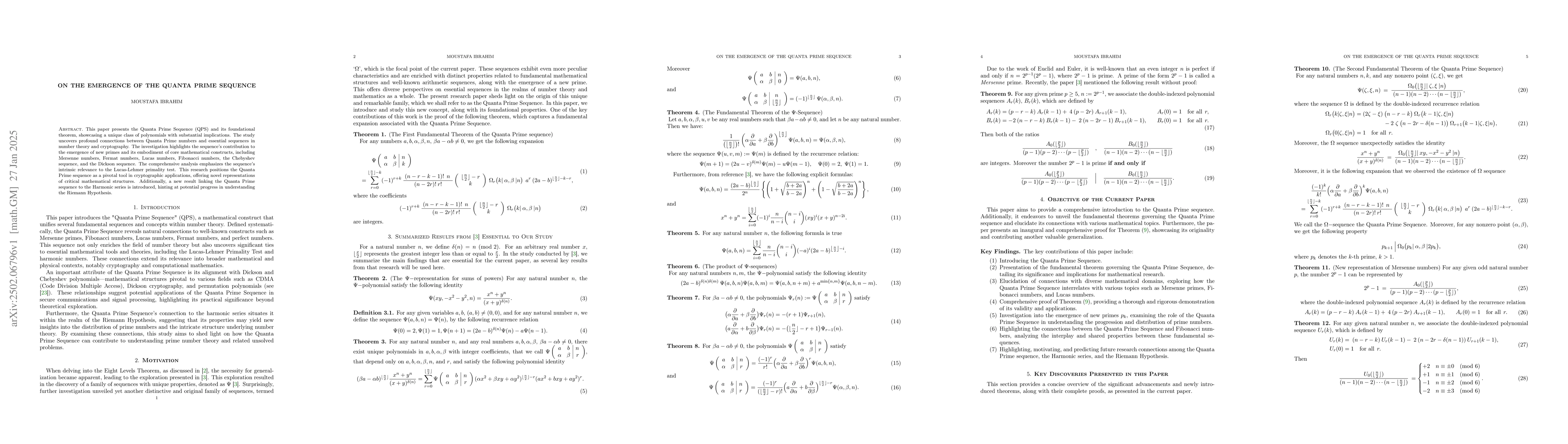This paper introduces the Quanta Prime Sequence (QPS) and its foundational theorem, revealing its deep connections to number theory and cryptography. The study highlights QPS's role in generating new primes and its relevance to various mathematical constructs, including Mersenne and Fibonacci numbers, and its significance in the Lucas-Lehmer primality test, positioning it as a crucial tool in cryptographic applications.