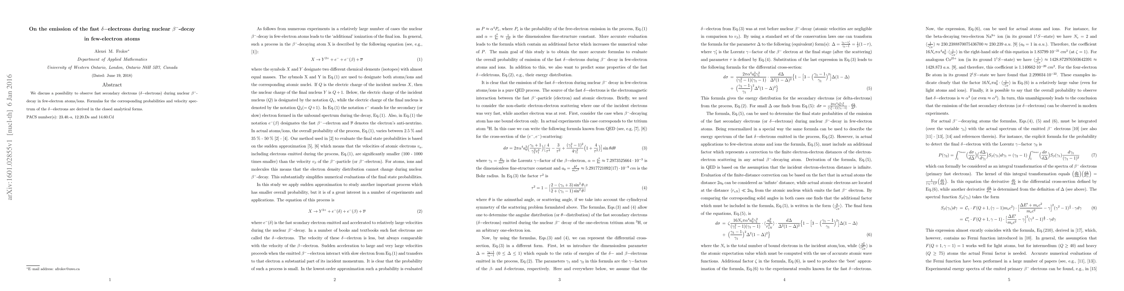 This paper explores the possibility of observing fast secondary electrons ($\delta-$electrons) during nuclear $\beta^{-}$-decay in few-electron atoms and ions, deriving closed analytical expressions for their probabilities and energy spectrum.