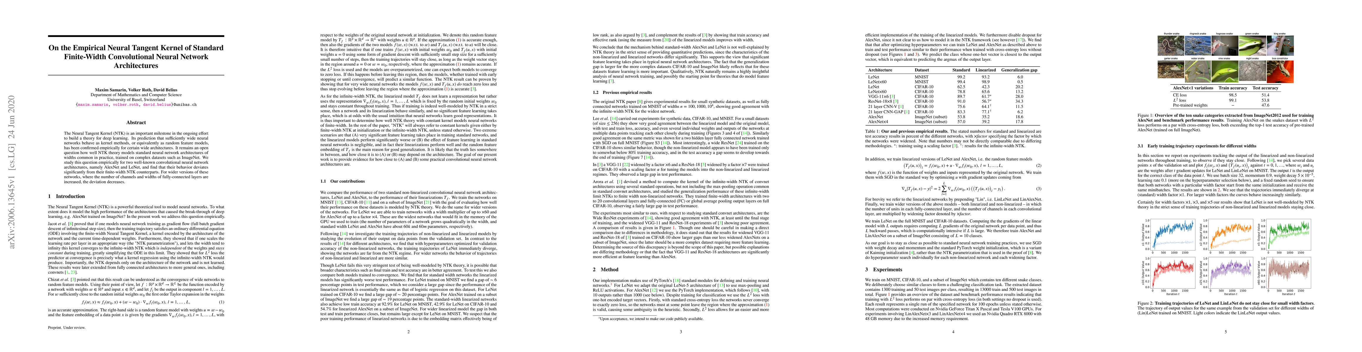 The Neural Tangent Kernel (NTK) is an important milestone in the ongoing effort to build a theory for deep learning. Its prediction that sufficiently wide neural networks behave as kernel methods, or equivalently as random feature models, has been confirmed empirically for certain wide architectures. It remains an open question how well NTK theory models standard neural network architectures of widths common in practice, trained on complex datasets such as ImageNet. We study this question empirically for two well-known convolutional neural network architectures, namely AlexNet and LeNet, and find that their behavior deviates significantly from their finite-width NTK counterparts. For wider versions of these networks, where the number of channels and widths of fully-connected layers are increased, the deviation decreases.