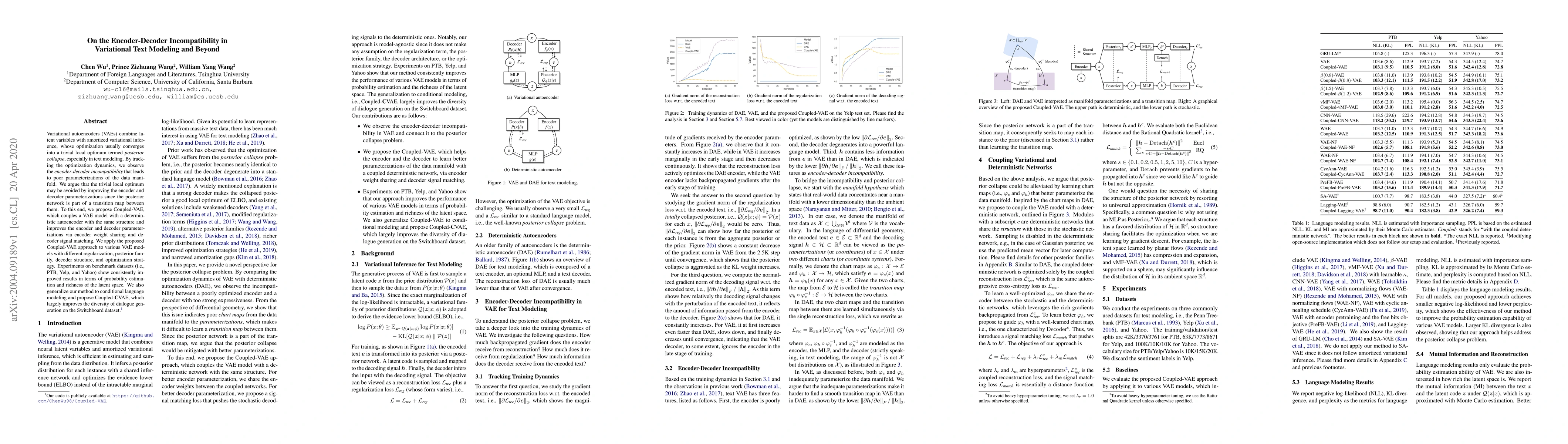 Variational autoencoders (VAEs) combine latent variables with amortized variational inference, whose optimization usually converges into a trivial local optimum termed posterior collapse, especially in text modeling. By tracking the optimization dynamics, we observe the encoder-decoder incompatibility that leads to poor parameterizations of the data manifold. We argue that the trivial local optimum may be avoided by improving the encoder and decoder parameterizations since the posterior network is part of a transition map between them. To this end, we propose Coupled-VAE, which couples a VAE model with a deterministic autoencoder with the same structure and improves the encoder and decoder parameterizations via encoder weight sharing and decoder signal matching. We apply the proposed Coupled-VAE approach to various VAE models with different regularization, posterior family, decoder structure, and optimization strategy. Experiments on benchmark datasets (i.e., PTB, Yelp, and Yahoo) show consistently improved results in terms of probability estimation and richness of the latent space. We also generalize our method to conditional language modeling and propose Coupled-CVAE, which largely improves the diversity of dialogue generation on the Switchboard dataset.
