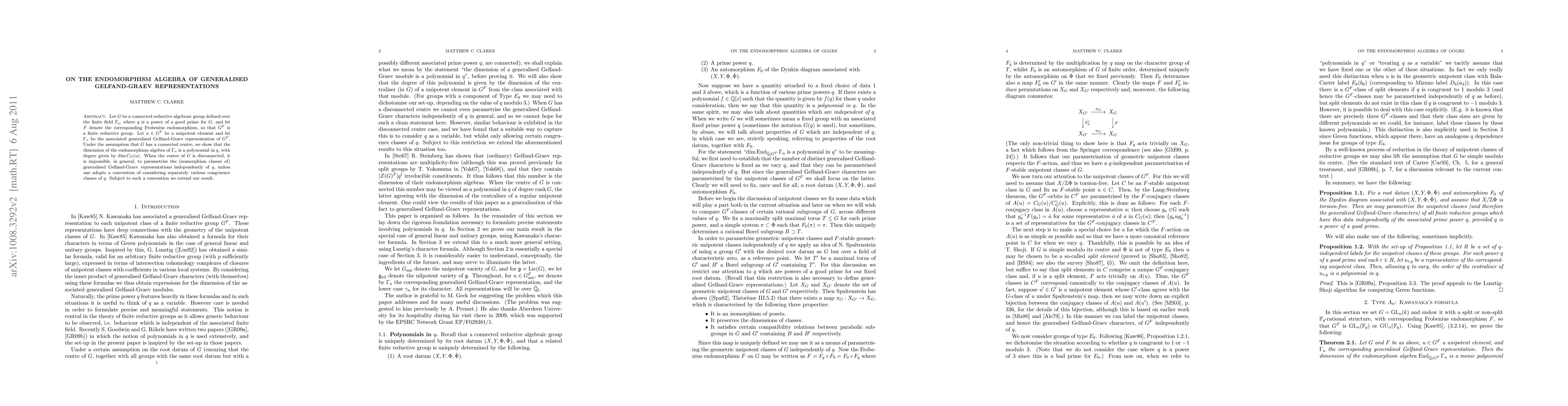 Let $G$ be a connected reductive algebraic group defined over the finite field $\F_q$, where $q$ is a power of a good prime for $G$, and let $F$ denote the corresponding Frobenius endomorphism, so that $G^F$ is a finite reductive group. Let $u \in G^F$ be a unipotent element and let $\Gamma_u$ be the associated generalised Gelfand-Graev representation of $G^F$. Under the assumption that $G$ has a connected centre, we show that the dimension of the endomorphism algebra of $\Gamma_u$ is a polynomial in $q$, with degree given by $\dim C_G(u)$. When the centre of $G$ is disconnected, it is impossible, in general, to parametrise the (isomorphism classes of) generalised Gelfand-Graev representations independently of $q$, unless one adopts a convention of considering separately various congruence classes of $q$. Subject to such a convention we extend our result.