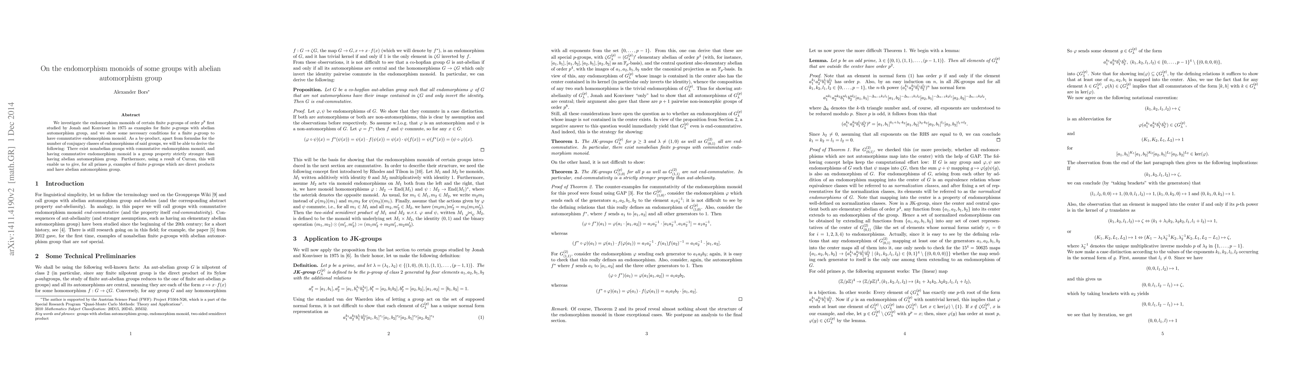 We investigate the endomorphism monoids of certain finite $p$-groups of order $p^8$ first studied by Jonah and Konvisser in 1975 as examples for finite $p$-groups with abelian automorphism group, and we show some necessary conditions for a finite $p$-group to have commutative endomorphism monoid. As a by-product, apart from formulas for the number of conjugacy classes of endomorphisms of said groups, we will be able to derive the following: There exist nonabelian groups with commutative endomorphism monoid, and having commutative endomorphism monoid is a group property strictly stronger than having abelian automorphism group. Furthermore, using a result of Curran, this will enable us to give, for all primes $p$, examples of finite $p$-groups which are direct products and have abelian automorphism group.