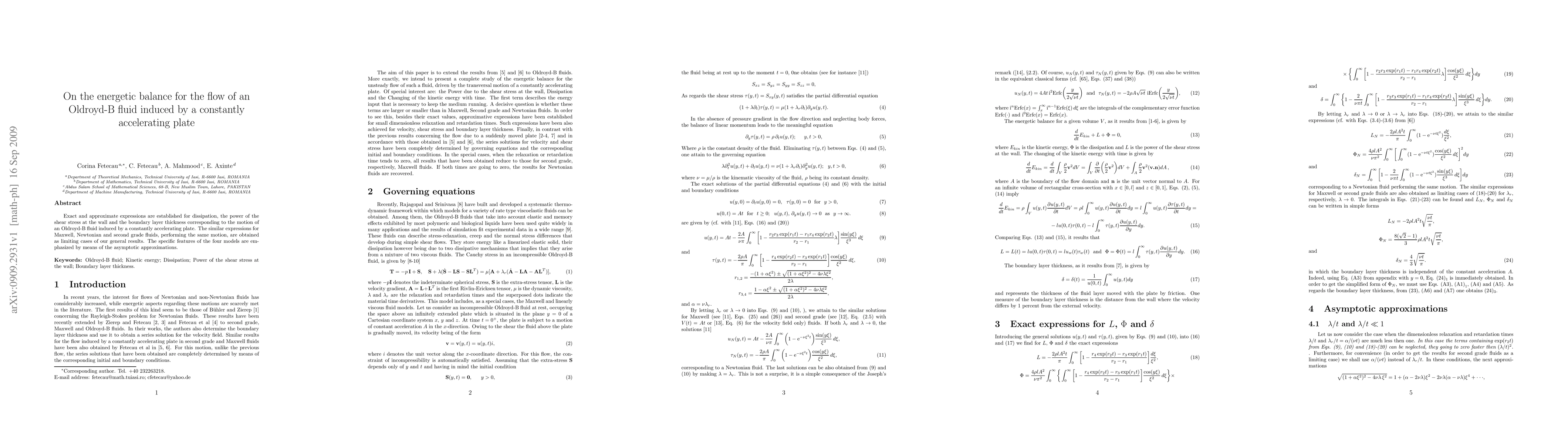 Exact and approximate expressions are established for dissipation, the power of the shear stress at the wall and the boundary layer thickness corresponding to the motion of an Oldroyd-B fluid induced by a constantly accelerating plate. The similar expressions for Maxwell, Newtonian and second grade fluids, performing the same motion, are obtained as limiting cases of our general results. The specific features of the four models are emphasized by means of the asymptotic approximations.