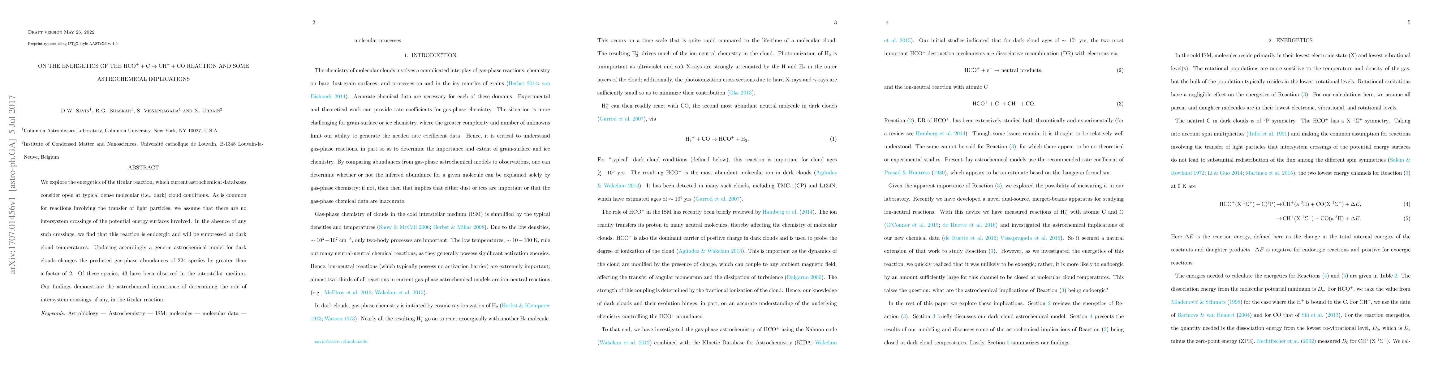 This paper investigates the energetics of the HCO$^+$ + C $\to$ CH$^+$ + CO reaction, finding it to be endoergic and thus suppressed at typical dark cloud temperatures. The updated astrochemical model significantly alters the predicted abundances of 224 species, including 43 observed in the interstellar medium, underscoring the need for further study on intersystem crossings in such reactions.