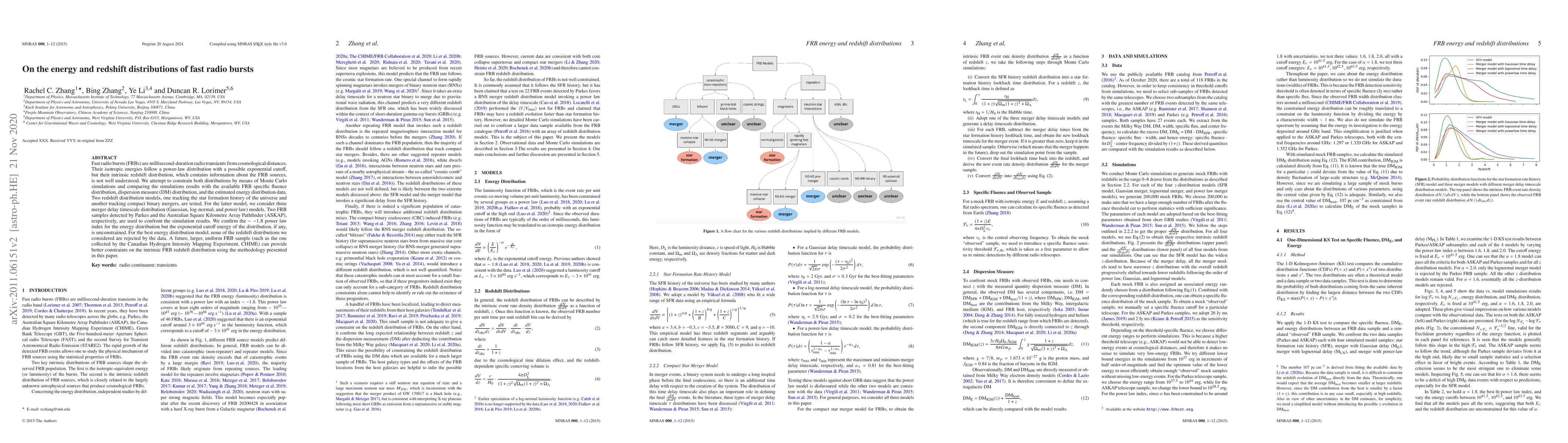 This paper investigates the energy and redshift distributions of fast radio bursts (FRBs) using Monte Carlo simulations and observational data. It confirms the $\sim -1.8$ power law for the energy distribution but finds no constraints on an exponential cutoff. Various redshift distribution models are tested, but none are conclusively rejected, suggesting future larger samples will better constrain the intrinsic FRB redshift distribution.