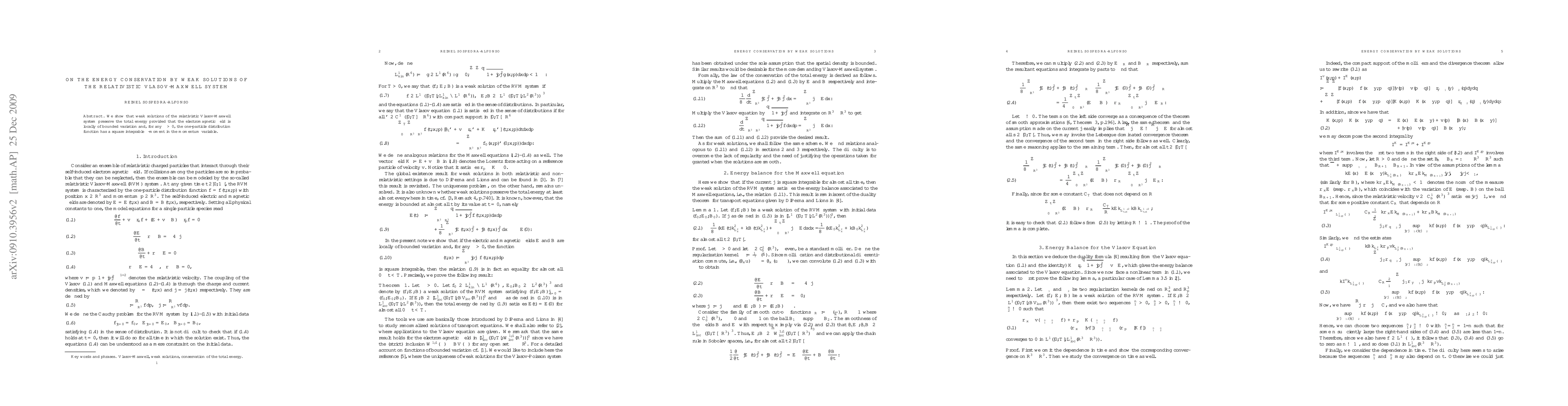 Weak solutions of the relativistic Vlasov-Maxwell system preserve total energy under certain conditions, including locally bounded variation of the electromagnetic field and square integrability of the one-particle distribution function.