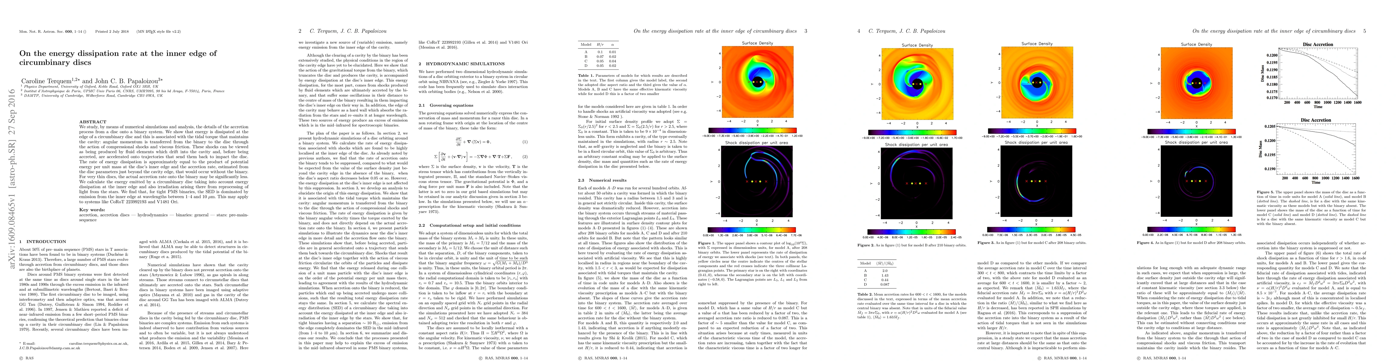 This research uses numerical simulations to study energy dissipation at the inner edge of circumbinary discs, attributing it to tidal torque and fluid acceleration. It finds that energy dissipation equals potential energy per unit mass at the inner edge multiplied by accretion rate, which may be lower for thin discs. The study also calculates energy emission from the inner edge, showing that for tight pre-main sequence binaries, the spectrum is dominated by emissions between 1-4 and 10 micrometers, potentially applicable to systems like CoRoT 223992193 and V1481 Ori.