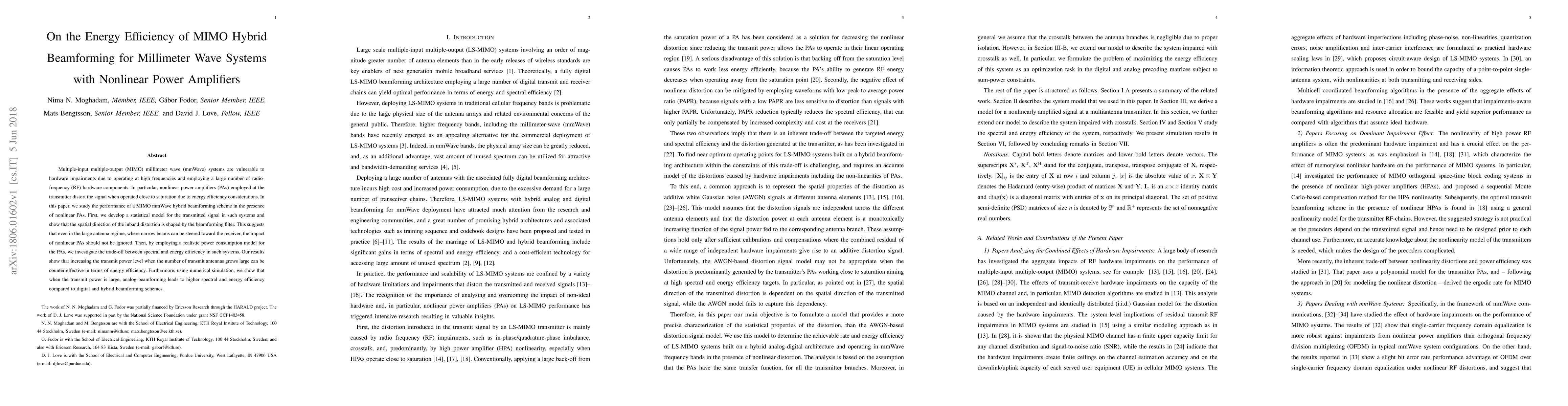 A study on MIMO hybrid beamforming in mmWave systems reveals that nonlinear power amplifiers can significantly impact energy efficiency, and analog beamforming is more efficient than digital or hybrid methods when transmit power is high.
