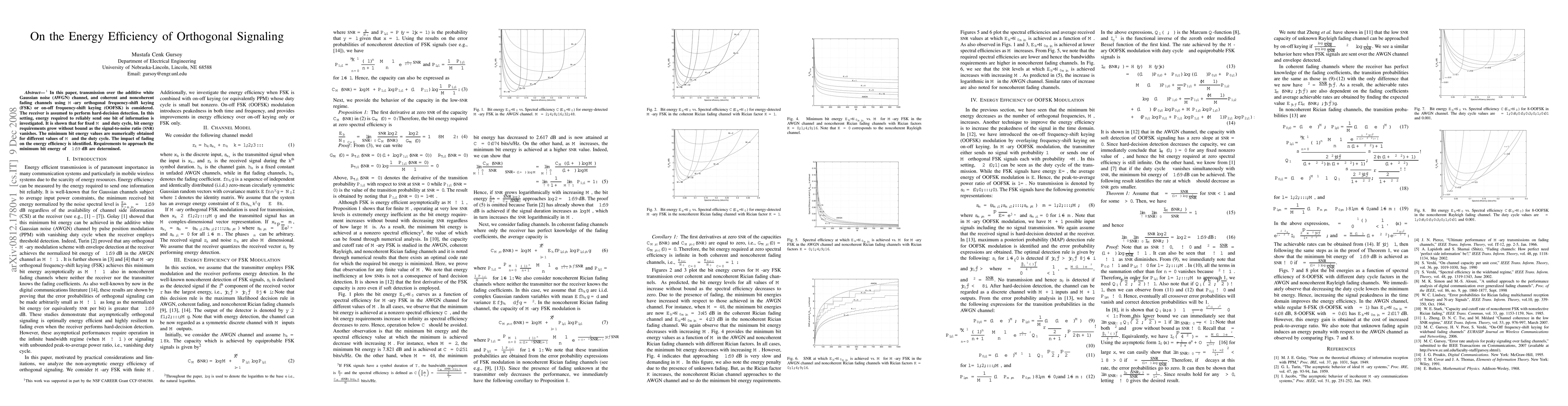 In this paper, transmission over the additive white Gaussian noise (AWGN) channel, and coherent and noncoherent fading channels using M-ary orthogonal frequency-shift keying (FSK) or on-off frequency-shift keying (OOFSK) is considered. The receiver is assumed to perform hard-decision detection. In this setting, energy required to reliably send one bit of information is investigated. It is shown that for fixed M and duty cycle, bit energy requirements grow without bound as the signal-to-noise ratio (SNR) vanishes. The minimum bit energy values are numerically obtained for different values of M and the duty cycle. The impact of fading on the energy efficiency is identified. Requirements to approach the minimum bit energy of -1.59 dB are determined.