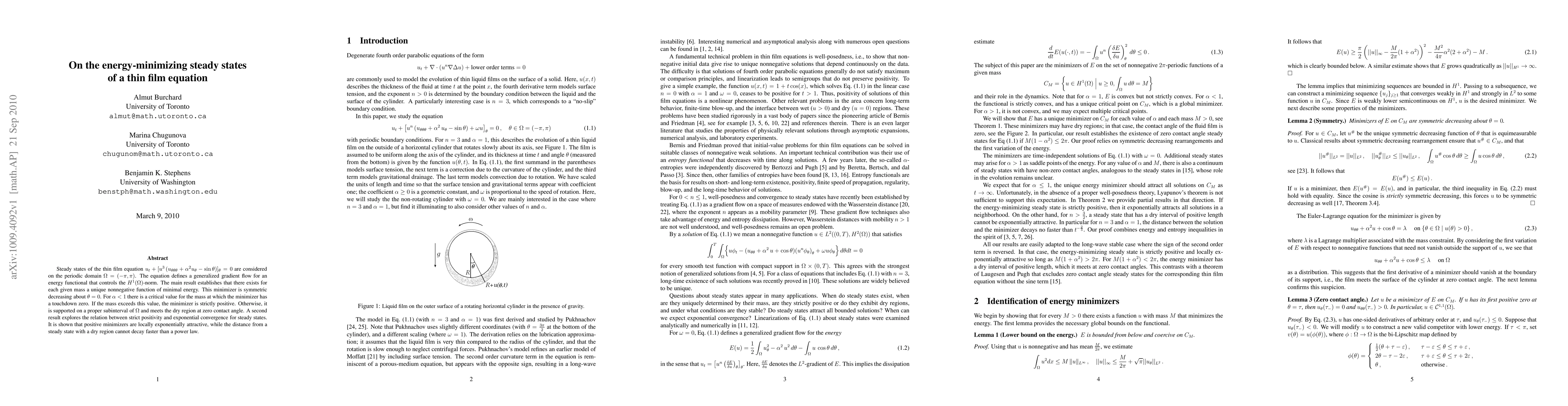 This paper investigates steady states of the thin film equation on a periodic domain, proving the existence of a unique nonnegative energy-minimizing function for each mass. For certain conditions, it demonstrates that the minimizer can have a touchdown zero, influencing its positivity and convergence properties.
