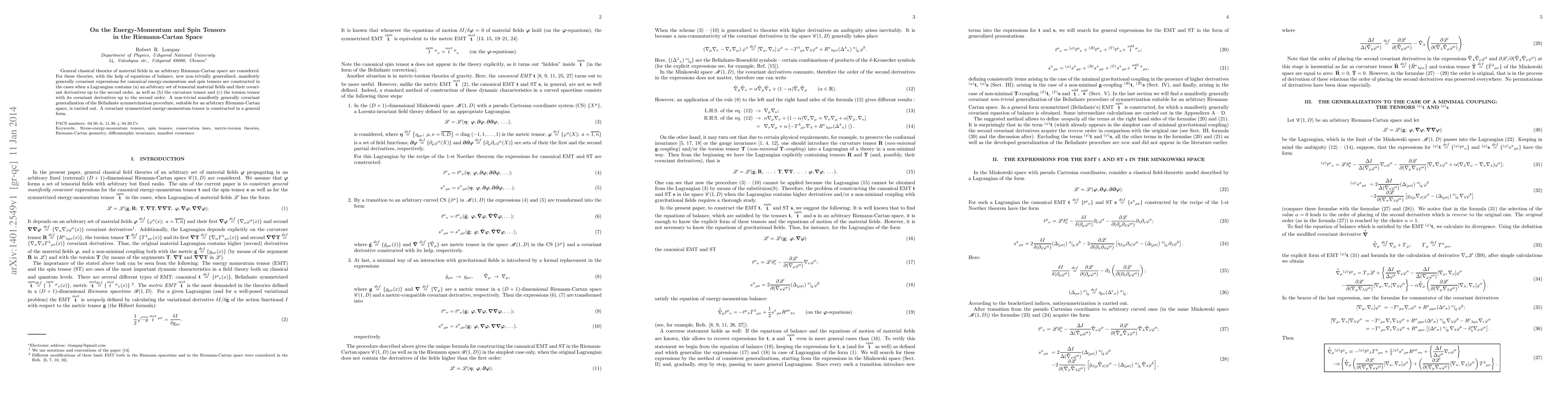 General classical theories of material fields in an arbitrary Riemann-Cartan space are considered. For these theories, with the help of equations of balance, new non-trivially generalized, manifestly generally covariant expressions for canonical energy-momentum and spin tensors are constructed in the cases when a Lagrangian contains (a) an arbitrary set of tensorial material fields and their covariant derivatives up to the second order, as well as (b) the curvature tensor and (c) the torsion tensor with its covariant derivatives up to the second order. A non-trivial manifestly generally covariant generalization of the Belinfante symmetrization procedure, suitable for an arbitrary Riemann-Cartan space, is carried out. A covariant symmetrized energy-momentum tensor is constructed in a general form.