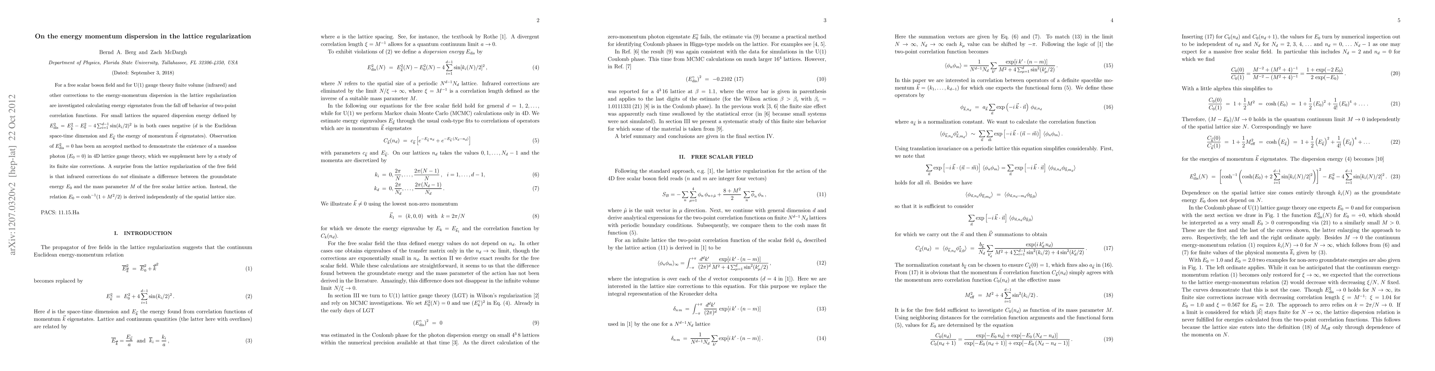 For a free scalar boson field and for U(1) gauge theory finite volume (infrared) and other corrections to the energy-momentum dispersion in the lattice regularization are investigated calculating energy eigenstates from the fall off behavior of two-point correlation functions. For small lattices the squared dispersion energy defined by $E_{\rm dis}^2=E_{\vec{k}}^2-E_0^2-4\sum_{i=1}^{d-1}\sin(k_i/2)^2$ is in both cases negative ($d$ is the Euclidean space-time dimension and $E_{\vec{k}}$ the energy of momentum $\vec{k}$ eigenstates). Observation of $E_{\rm dis}^2=0$ has been an accepted method to demonstrate the existence of a massless photon ($E_0=0$) in 4D lattice gauge theory, which we supplement here by a study of its finite size corrections. A surprise from the lattice regularization of the free field is that infrared corrections do {\it not} eliminate a difference between the groundstate energy $E_0$ and the mass parameter $M$ of the free scalar lattice action. Instead, the relation $E_0=\cosh^{-1} (1+M^2/2)$ is derived independently of the spatial lattice size.