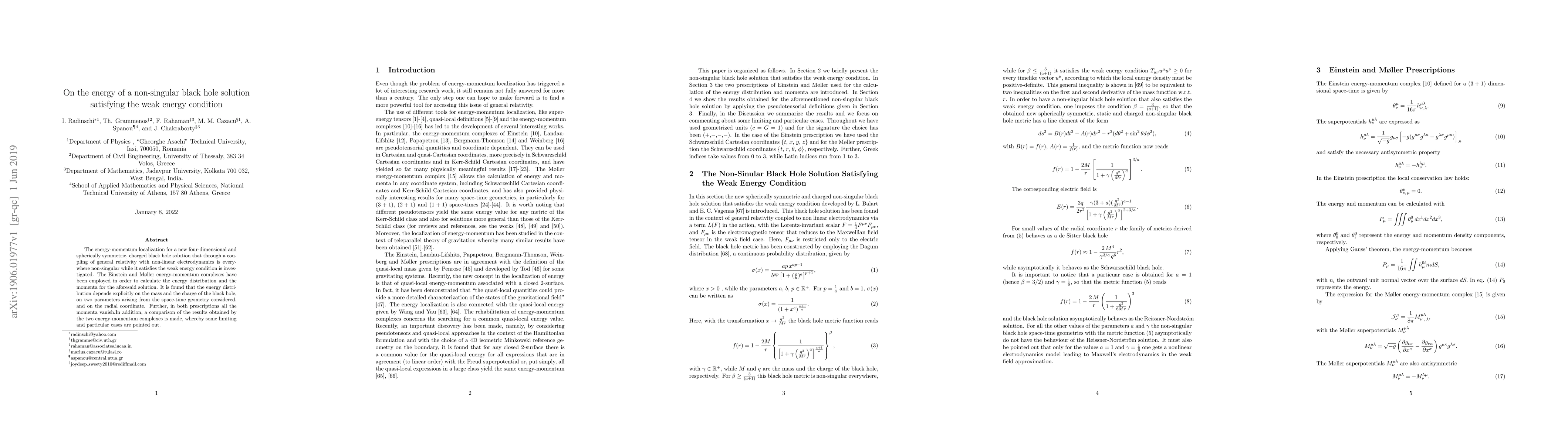 This paper investigates the energy-momentum localization of a new four-dimensional, spherically symmetric, charged black hole solution that is non-singular and satisfies the weak energy condition. Using Einstein and Møller energy-momentum complexes, it finds that the energy distribution depends on mass, charge, and space-time geometry parameters, and that all momenta vanish in both prescriptions.