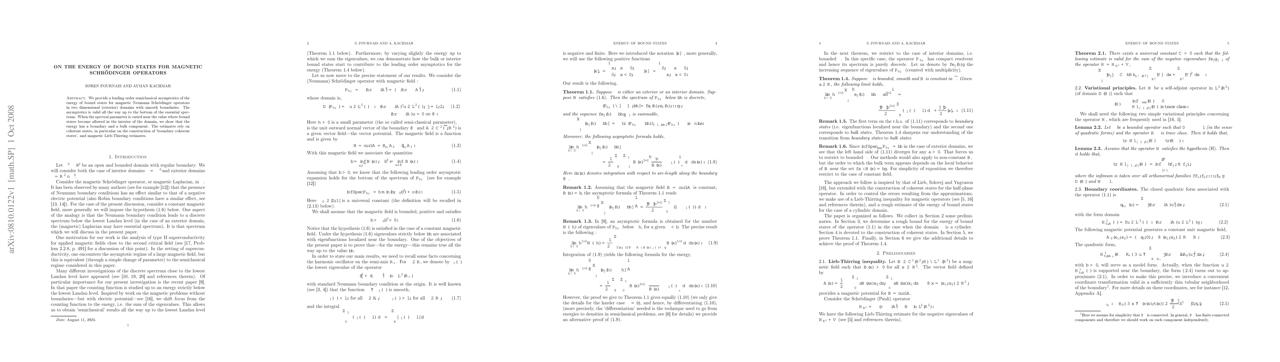 This paper provides a leading order semiclassical asymptotics of the energy of bound states for magnetic Schr"odinger operators in two-dimensional domains with smooth boundaries. It shows that the energy has both boundary and bulk components as the spectral parameter varies near where bound states become allowed.
