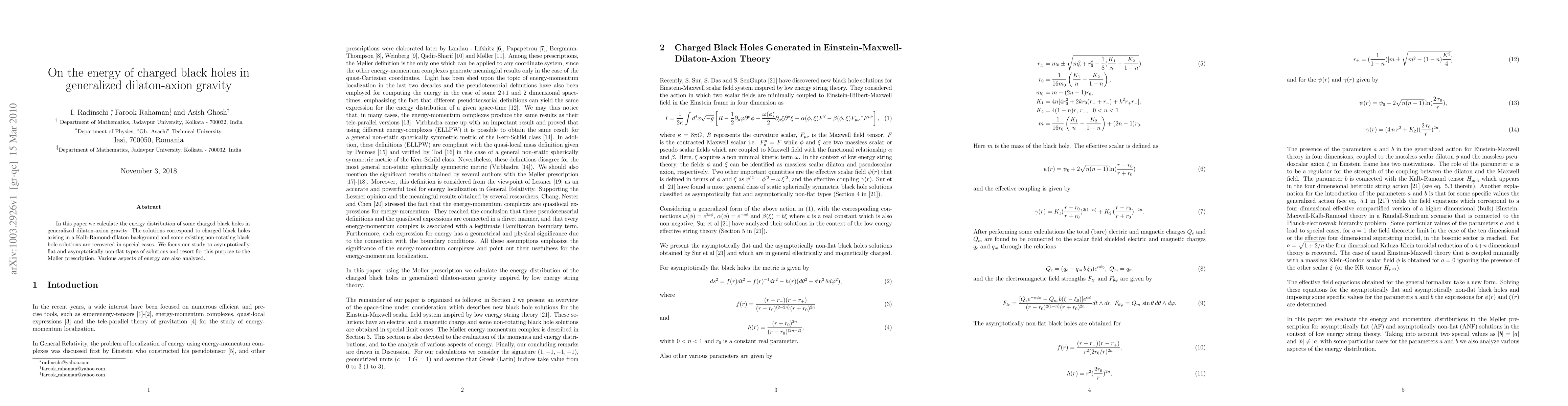 In this paper we calculate the energy distribution of some charged black holes in generalized dilaton-axion gravity. The solutions correspond to charged black holes arising in a Kalb-Ramond-dilaton background and some existing non-rotating black hole solutions are recovered in special cases. We focus our study to asymptotically flat and asymptotically non-flat types of solutions and resort for this purpose to the M{\o}ller prescription. Various aspects of energy are also analyzed.