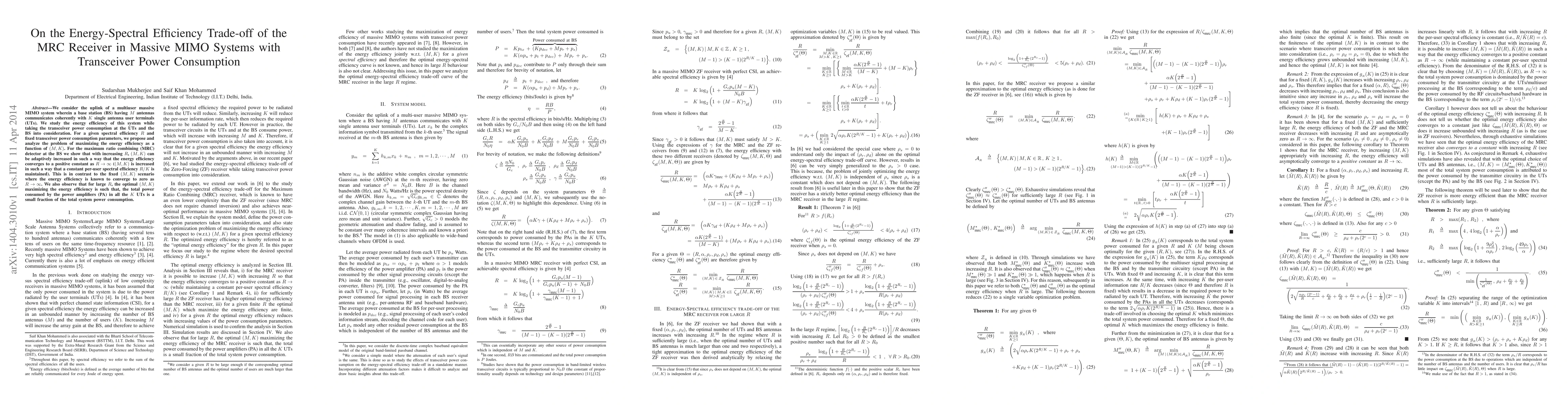 This paper investigates the energy-spectral efficiency trade-off in a multiuser massive MIMO system, focusing on the MRC receiver. It proposes maximizing energy efficiency by adaptively increasing the number of antennas $(M)$ and users $(K)$ as spectral efficiency $(R)$ grows, demonstrating that energy efficiency converges to a positive constant rather than zero, unlike fixed $(M,K)$ scenarios.