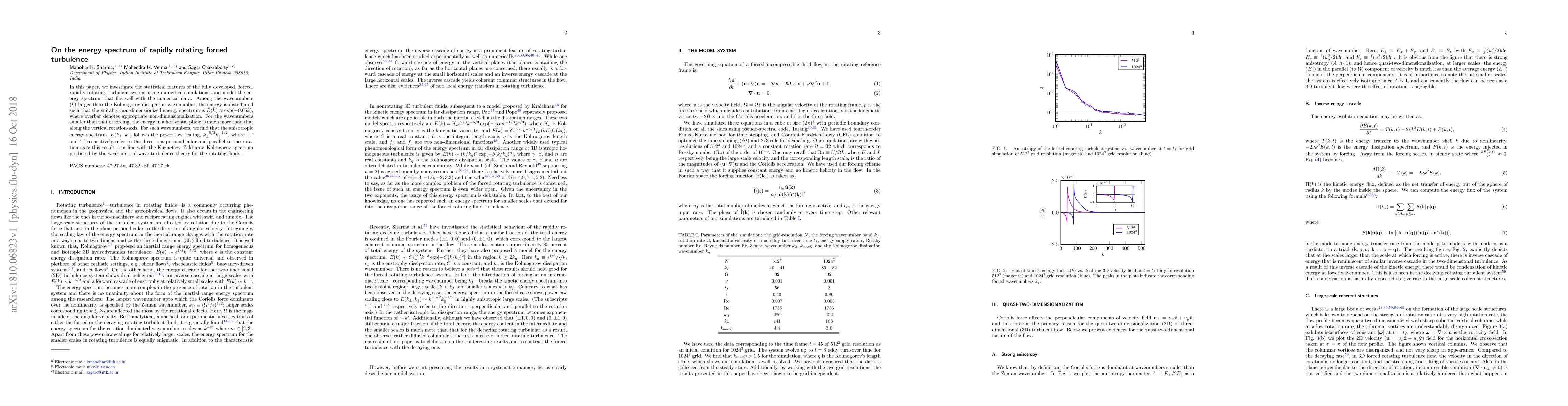 In this paper, we investigate the statistical features of the fully developed, forced, rapidly rotating, {turbulent} system using numerical simulations, and model {the} energy {spectrum} that {fits} well with the numerical data. Among the wavenumbers ($k$) larger than the Kolmogorov dissipation wavenumber, the energy is distributed such that the suitably non-dimensionized energy spectrum is ${\bar E}({\bar k})\approx \exp(-0.05{\bar k})$, where overbar denotes appropriate non-dimensionalization. {For the wavenumbers smaller than that of forcing, the energy in a horizontal plane is much more than that along the vertical rotation-axis.} {For} such wavenumbers, we find that the anisotropic energy spectrum, $E(k_\perp,k_\parallel)$ follows the power law scaling, $k_\perp^{-5/2}k_\parallel^{-1/2}$, where `$\perp$' and `$\parallel$' respectively refer to the directions perpendicular and parallel to the rotation axis; this result is in line with the Kuznetsov--Zakharov--Kolmgorov spectrum predicted by the weak inertial-wave turbulence theory for the rotating fluids.