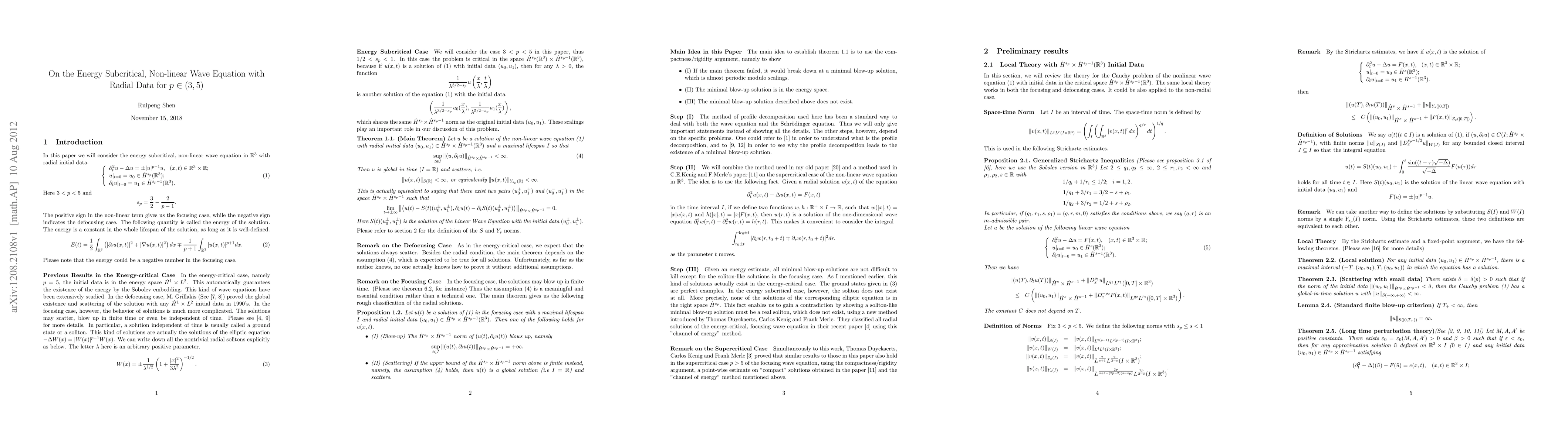 This paper investigates the energy-subcritical, non-linear wave equation in 3D with radial data for $p\in (3,5)$. It demonstrates that bounded radial solutions are globally defined and scatter, utilizing compactness/rigidity arguments, decay estimates, and gain of regularity.