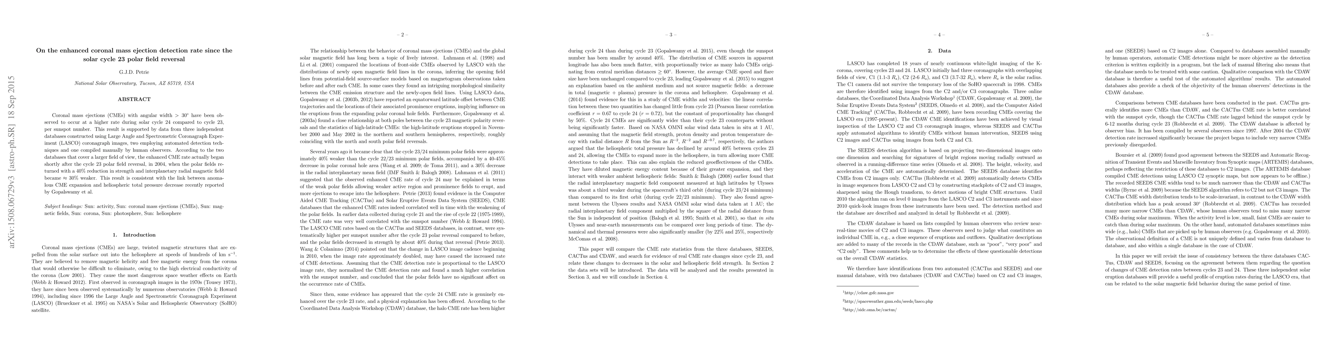 This study finds a higher detection rate of coronal mass ejections (CMEs) with angular widths greater than 30° during solar cycle 24 compared to cycle 23, supported by three independent databases. The increase in CME rate began shortly after the 2004 polar field reversal, correlating with a reduction in polar field strength and interplanetary radial magnetic field.