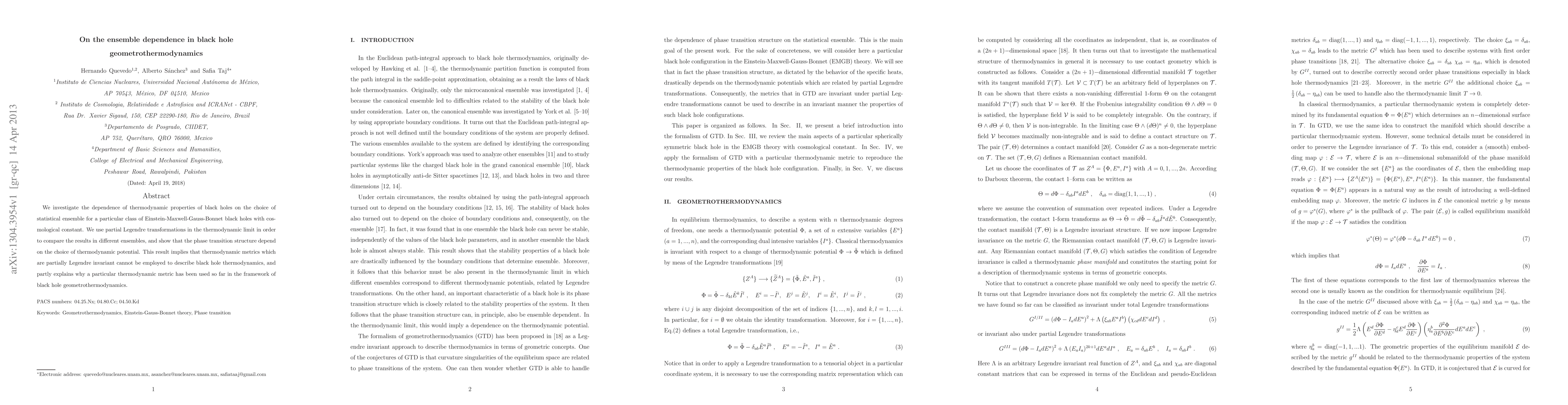 We investigate the dependence of thermodynamic properties of black holes on the choice of statistical ensemble for a particular class of Einstein-Maxwell-Gauss-Bonnet black holes with cosmological constant. We use partial Legendre transformations in the thermodynamic limit in order to compare the results in different ensembles, and show that the phase transition structure depend on the choice of thermodynamic potential. This result implies that thermodynamic metrics which are partially Legendre invariant cannot be employed to describe black hole thermodynamics, and partly explains why a particular thermodynamic metric has been used so far in the framework of black hole geometrothermodynamics.