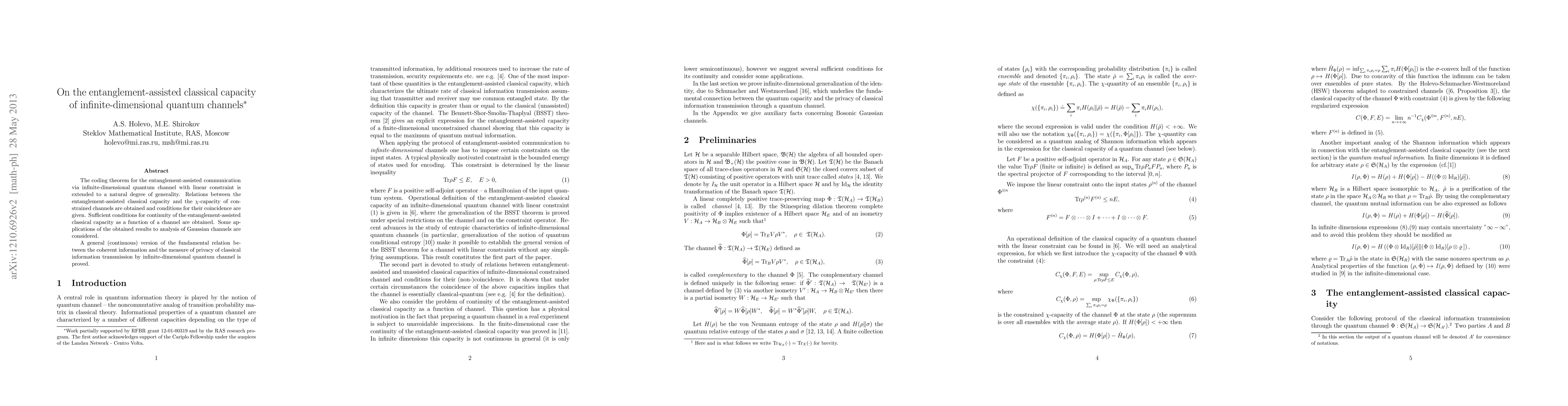 This paper extends the coding theorem for entanglement-assisted communication through infinite-dimensional quantum channels, establishing relationships between the entanglement-assisted classical capacity and the $\chi$-capacity of constrained channels. It also proves a general relation between coherent information and privacy in classical information transmission.