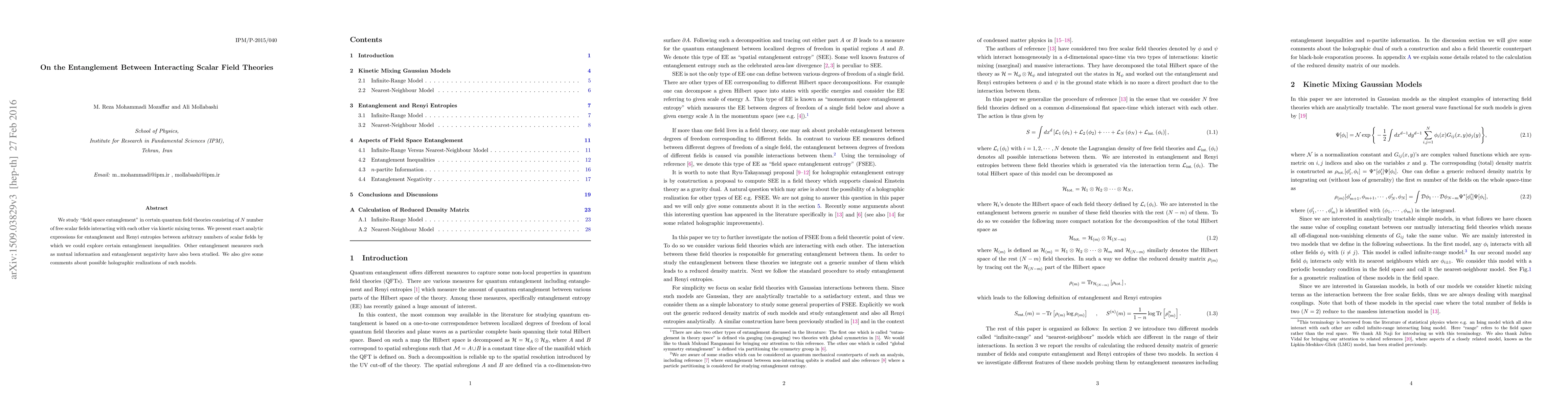 This paper explores "field space entanglement" in quantum field theories with interacting scalar fields, deriving exact analytic expressions for entanglement and Renyi entropies. It also investigates mutual information and entanglement negativity, and discusses potential holographic realizations.