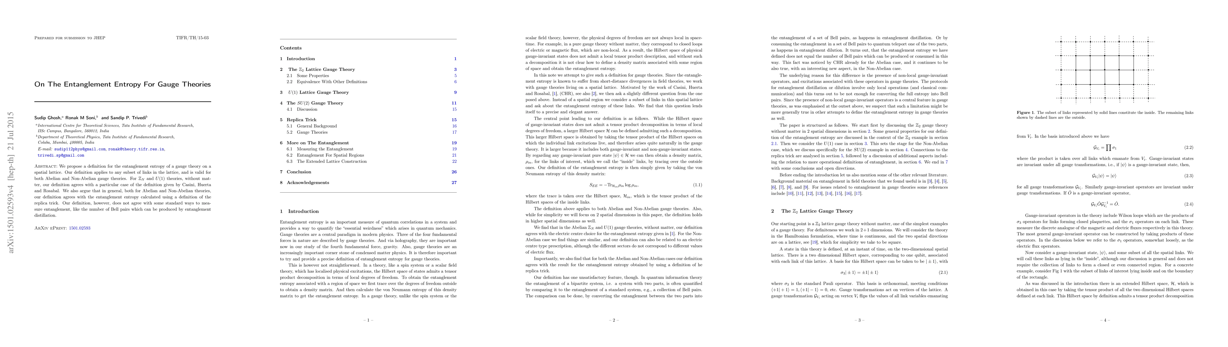 This paper proposes a new definition for the entanglement entropy in gauge theories on a spatial lattice, applicable to both Abelian and Non-Abelian cases. It aligns with existing definitions for $\mathbb{Z}_N$ and $U(1)$ theories without matter, but diverges from standard entanglement measures like the number of Bell pairs.