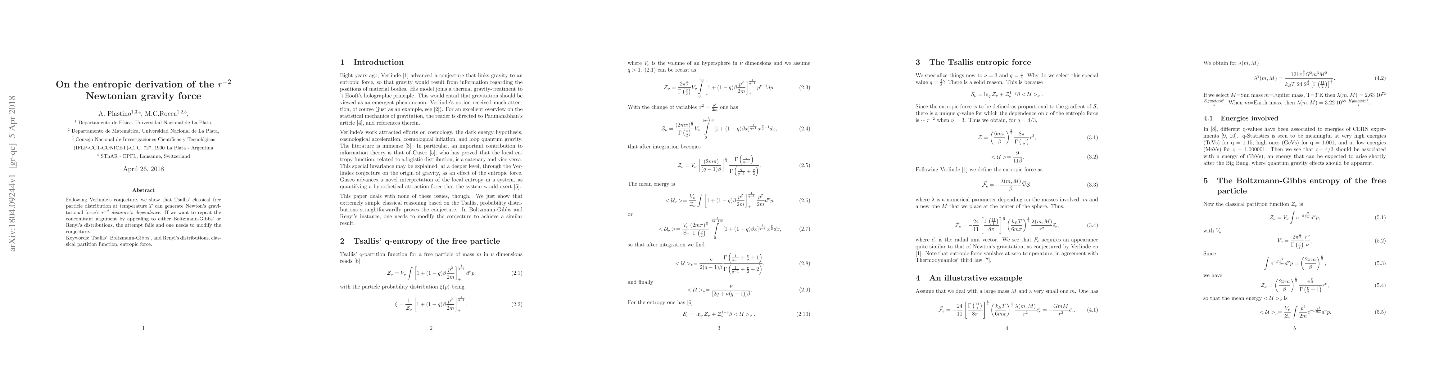 Following Verlinde's conjecture, we show that Tsallis' classical free particle distribution at temperature $T$ can generate Newton's gravitational force's $r^{-2}$ {\it distance's dependence}. If we want to repeat the concomitant argument by appealing to either Boltzmann-Gibbs' or Renyi's distributions, the attempt fails and one needs to modify the conjecture. Keywords: Tsallis', Boltzmann-Gibbs', and Renyi's distributions, classical partition function, entropic force.