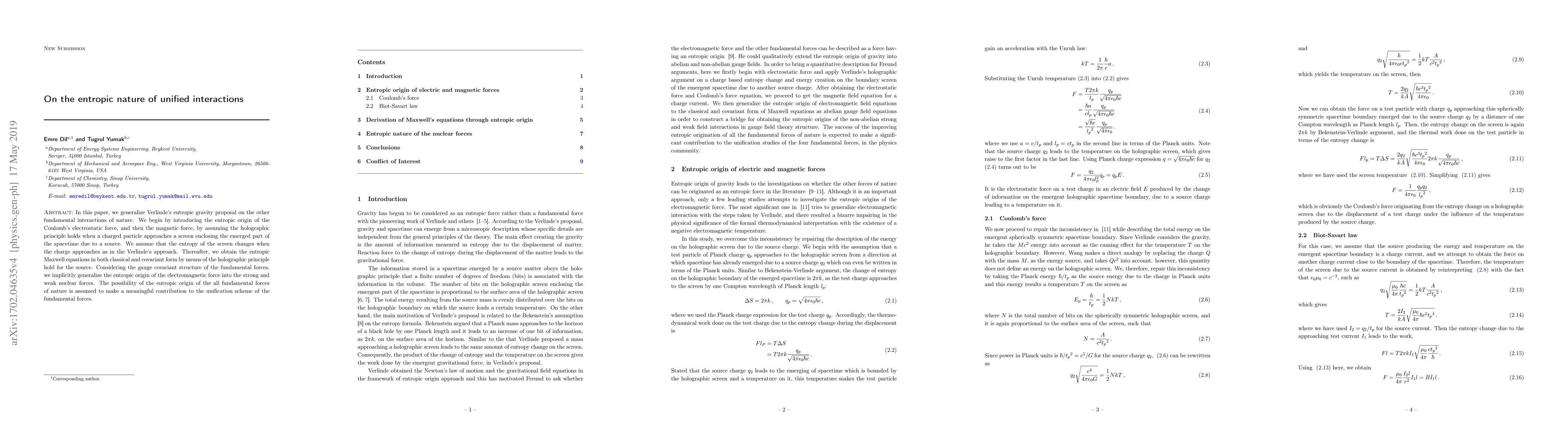 This paper generalizes Verlinde's entropic gravity to unify all fundamental interactions, deriving the entropic origins of electrostatic and magnetic forces via the holographic principle, and extending this framework to the strong and weak nuclear forces. The entropic approach aims to contribute to the unification of all fundamental forces.