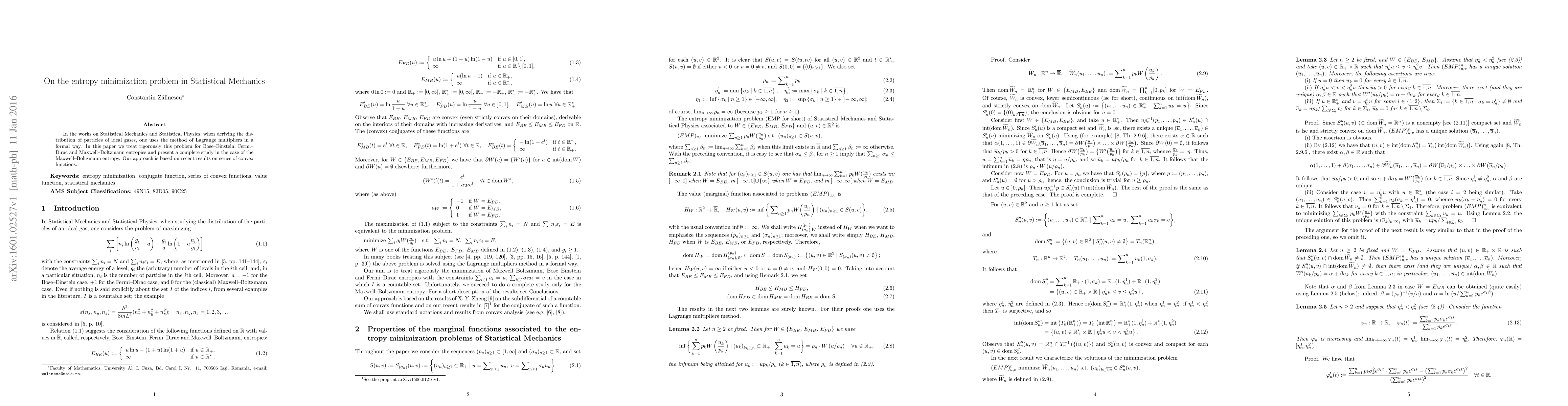 This paper rigorously addresses the entropy minimization problem in Statistical Mechanics for Bose-Einstein, Fermi-Dirac, and Maxwell-Boltzmann distributions using Lagrange multipliers, with a detailed study focusing on the Maxwell-Boltzmann entropy, leveraging recent advancements in convex function series.