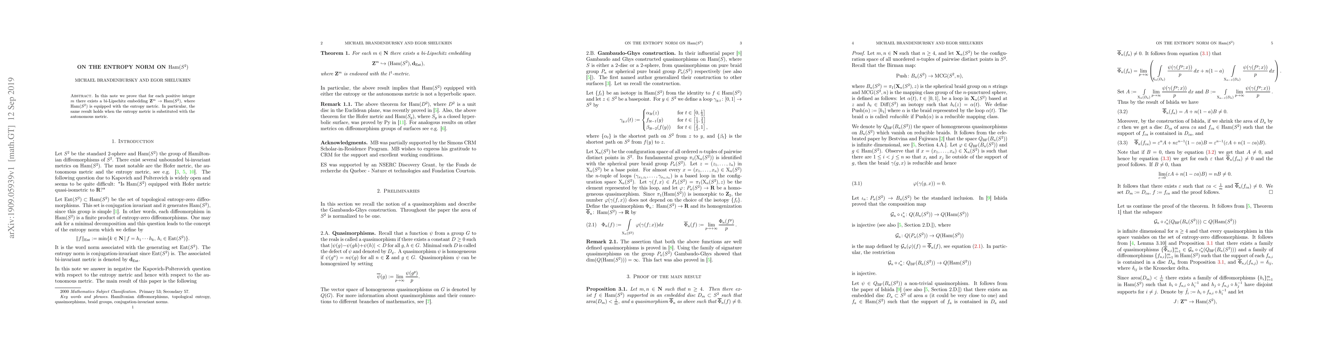 In this note we prove that for each positive integer $m$ there exists a bi-Lipschitz embedding $Z^m\to Ham(S^2)$, where $Ham(S^2)$ is equipped with the entropy metric. In particular, the same result holds when the entropy metric is substituted with the autonomous metric.