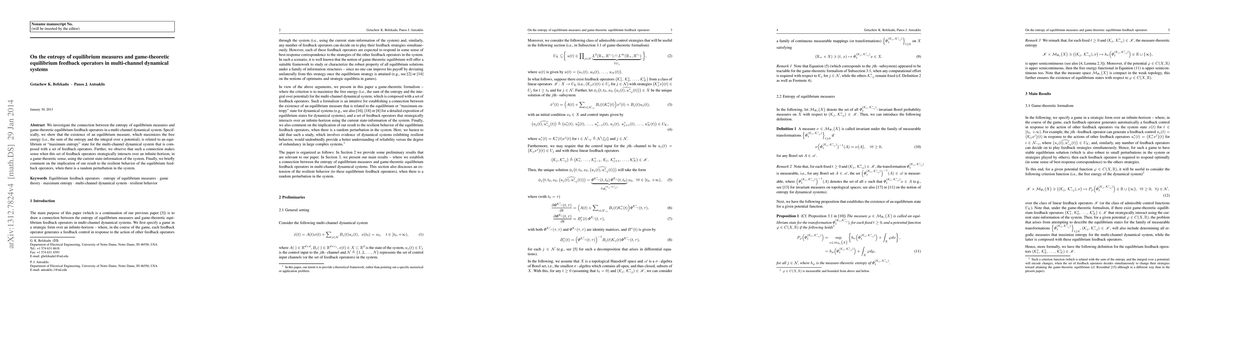 We investigate the connection between the entropy of equilibrium measures and game-theoretic equilibrium feedback operators in a multi-channel dynamical system. Specifically, we show that the existence of an equilibrium measure, which maximizes the free energy (i.e., the sum of the entropy and the integral over a potential), is related to an equilibrium or "maximum entropy" state for the multi-channel dynamical system that is composed with a set of feedback operators. Further, we observe that such a connection makes sense when this set of feedback operators strategically interacts over an infinite-horizon, in a game-theoretic sense, using the current state-information of the system. Finally, we briefly comment on the implication of our result to the resilient behavior of the equilibrium feedback operators, when there is a random perturbation in the system.