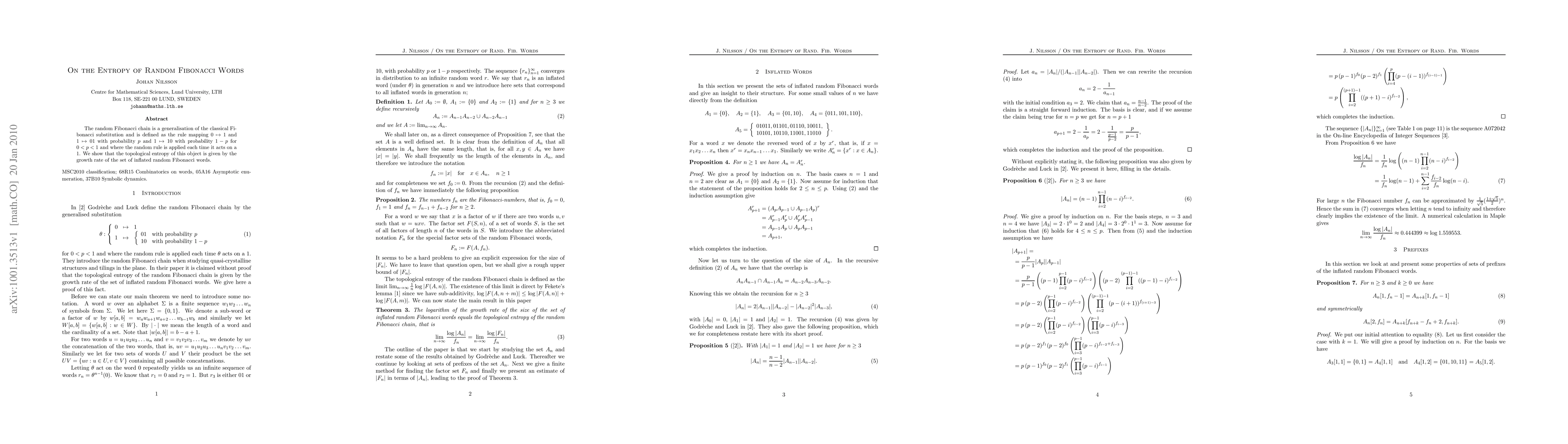 The random Fibonacci chain is a generalisation of the classical Fibonacci substitution and is defined as the rule mapping $0\mapsto 1$ and $1 \mapsto 01$ with probability $p$ and $1 \mapsto 10$ with probability $1-p$ for $0