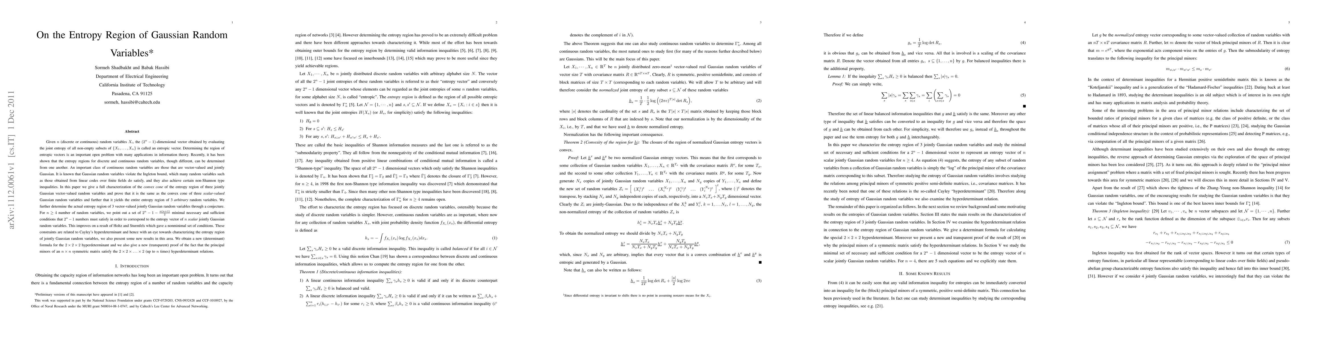 This paper characterizes the entropy region of three jointly Gaussian vector-valued random variables, proving it matches the region for three scalar-valued Gaussian variables. It also proposes minimal conditions for n jointly Gaussian random variables, improving previous results, and presents new findings related to Cayley's hyperdeterminant.