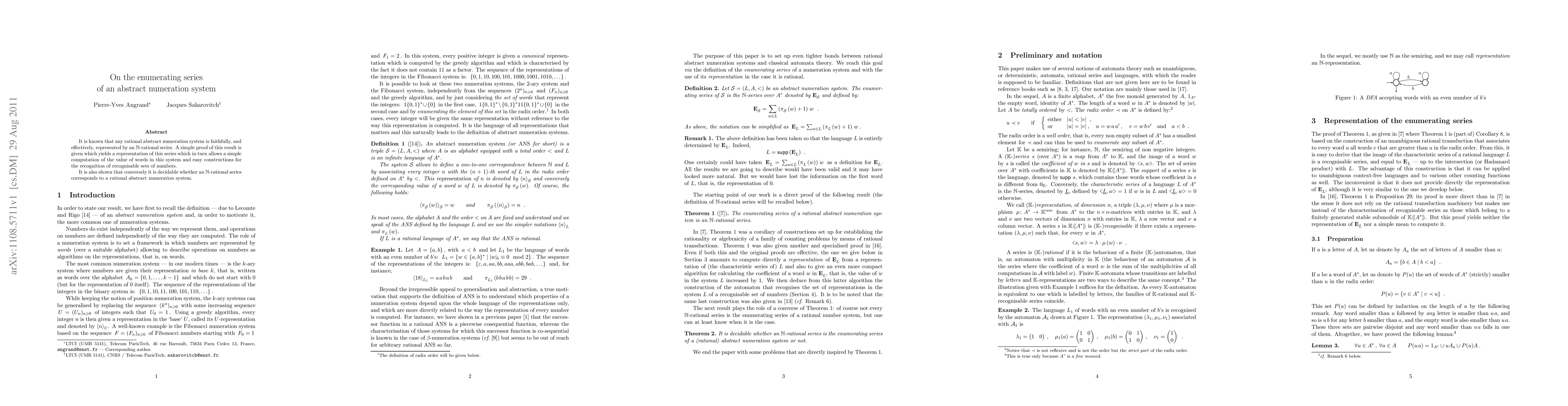 It is known that any rational abstract numeration system is faithfully, and effectively, represented by an N-rational series. A simple proof of this result is given which yields a representation of this series which in turn allows a simple computation of the value of words in this system and easy constructions for the recognition of recognisable sets of numbers. It is also shown that conversely it is decidable whether an N-rational series corresponds to a rational abstract numeration system.